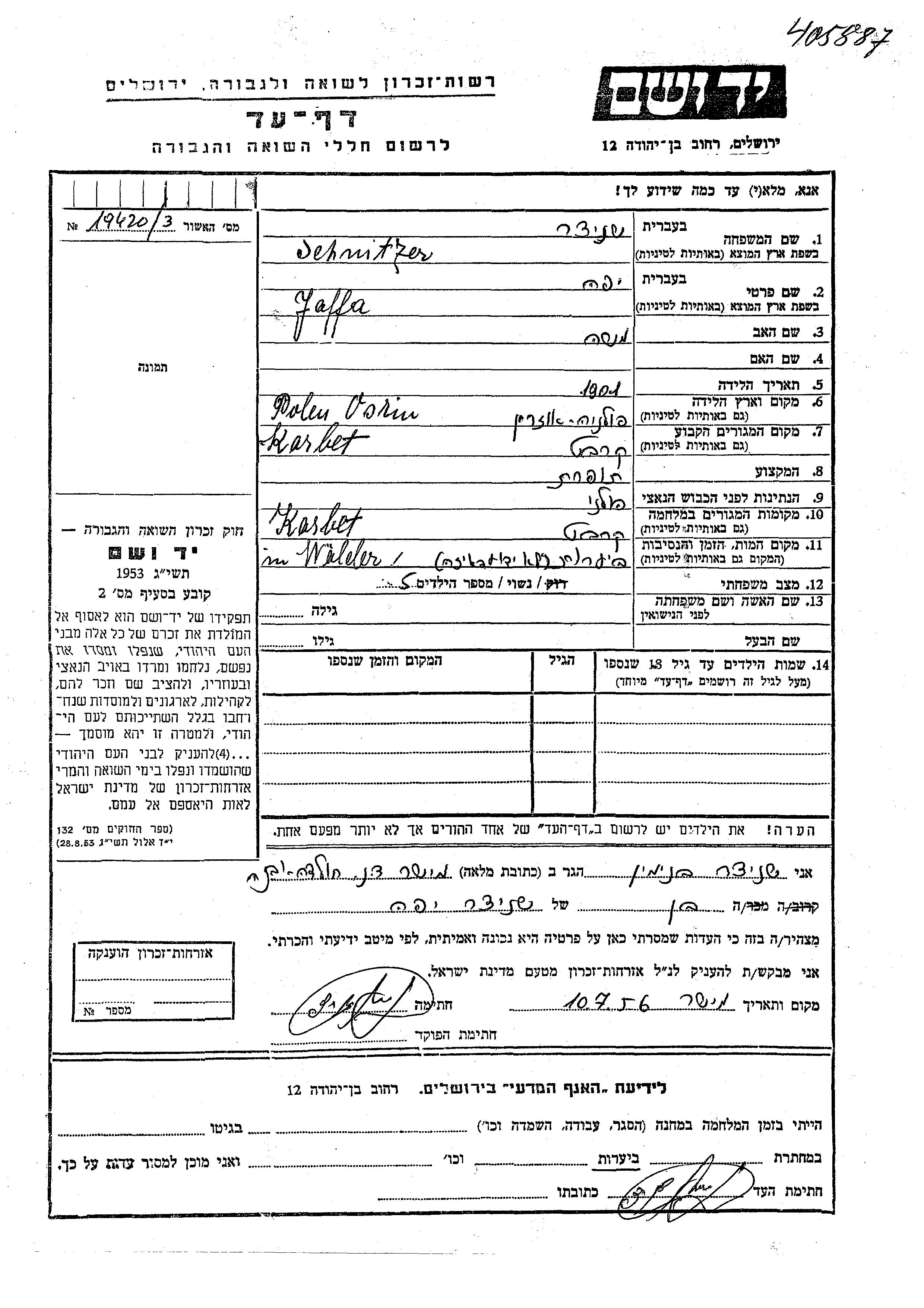 Яффа Шницер, место рождения: Озеряны, Польша. Отец: Моше. Швея. Женат / замужем. Место жительства до войны: Krowatka, Польша. Место во время войны: Krowatka, Польша.