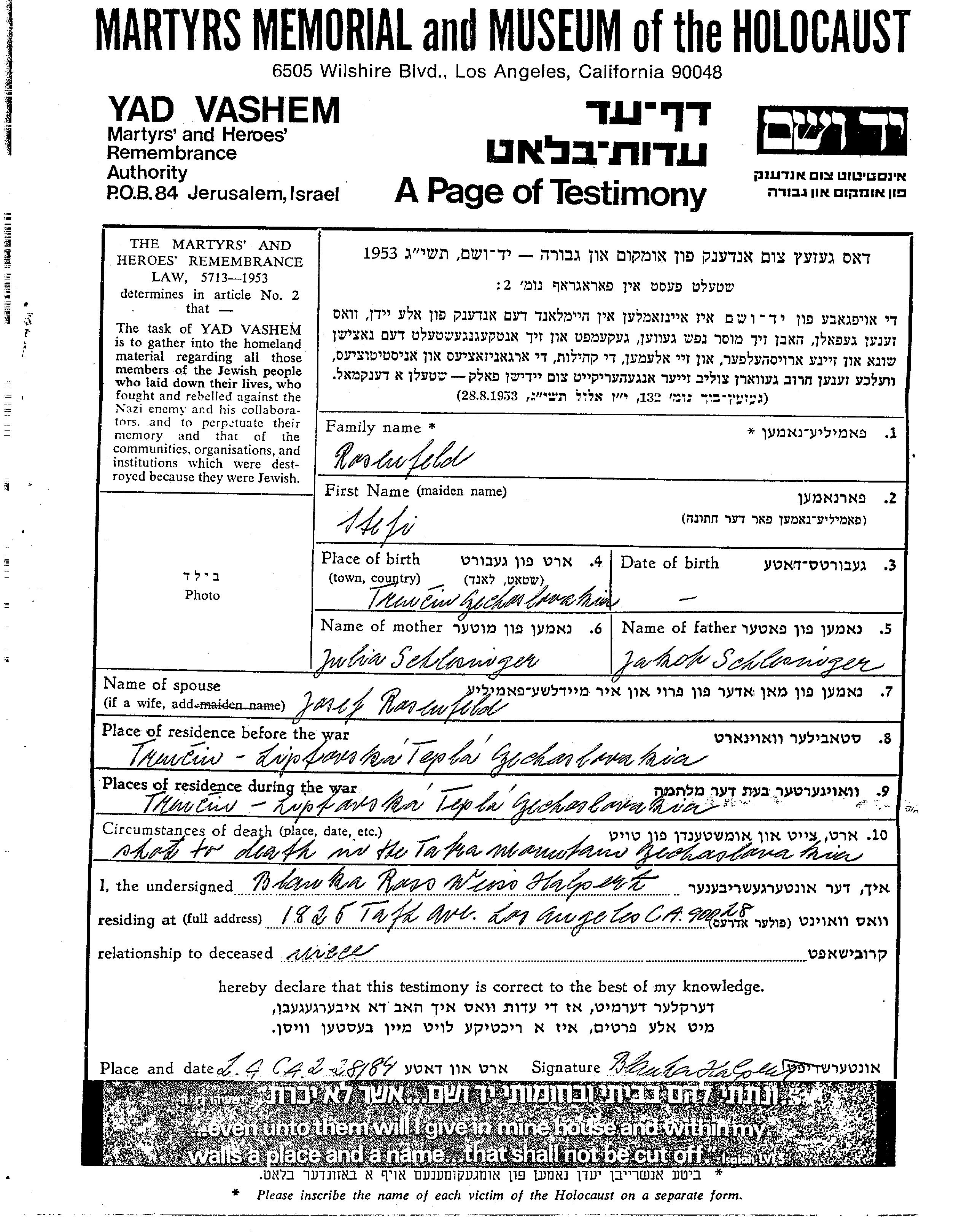 Розенфельд Штефи Тренчин, Чехословакия Лист свидетельских показаний