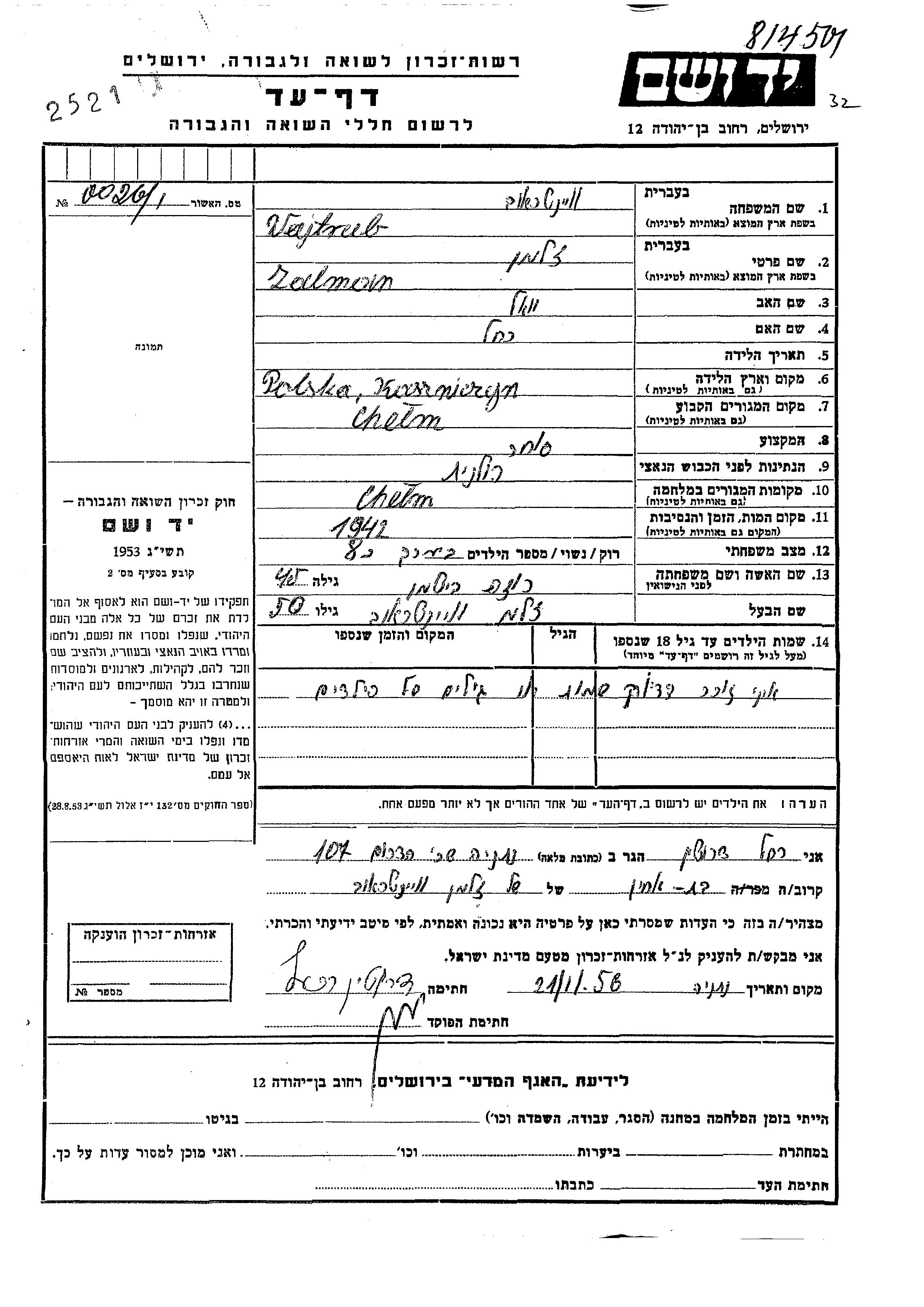 Залман Вейнтруб, место рождения: Красничин, Польша. Отец: Йоэль, mать:Рахель. Торговец / торговка. Женат / замужем. Место жительства до войны: Хелм, Польша. Место во время войны: Хелм, Польша.