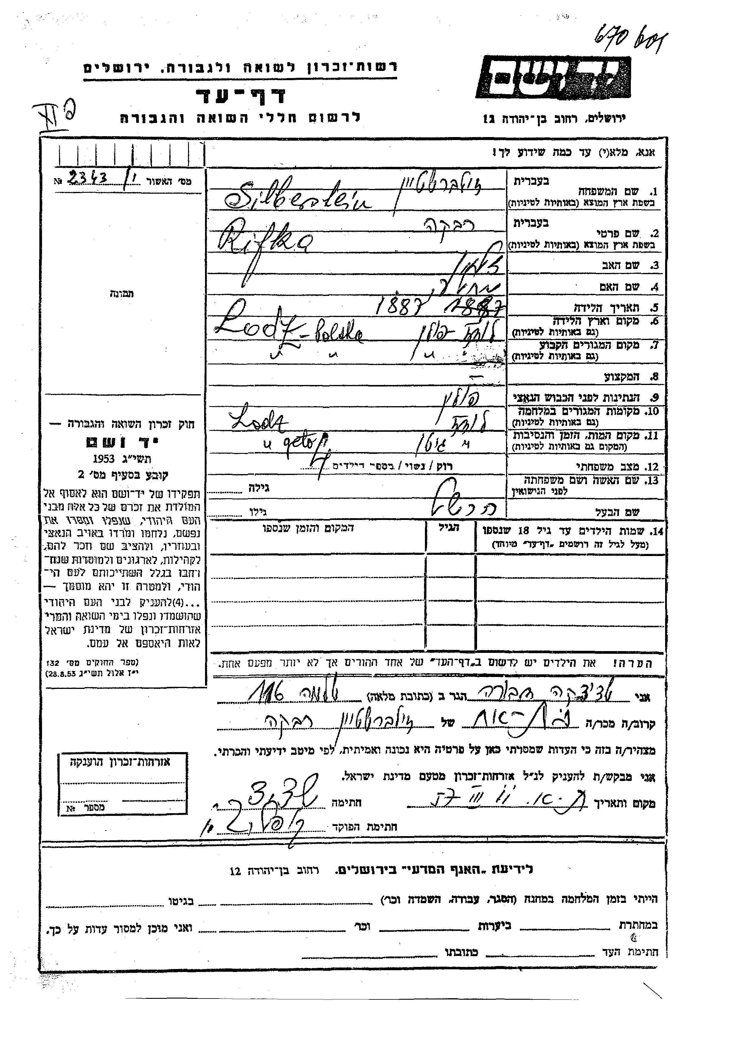 Рифка Сильберштейн, место рождения: Лодзь, Польша. Отец: Залман. Женат / замужем. Место жительства до войны: Лодзь, Польша. Место во время войны: Лодзь, Польша.
