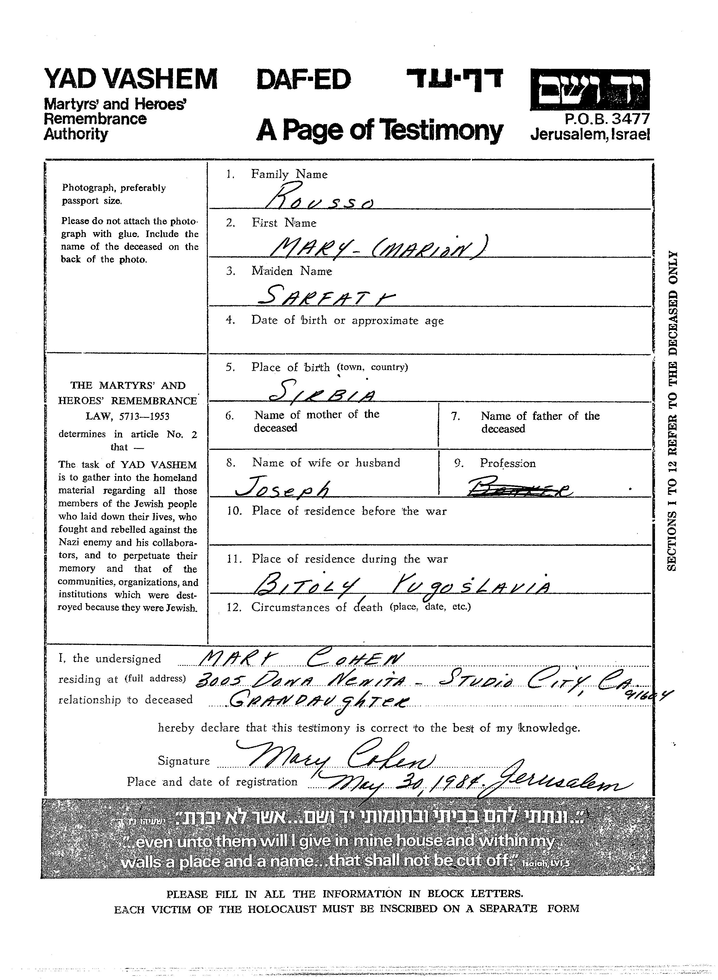 Мери Марион Руссо, девичья фамилия Сарфати, место рождения: Сербия (Южная), Югославия. Женат / замужем. Место во время войны: Битоль, Югославия.