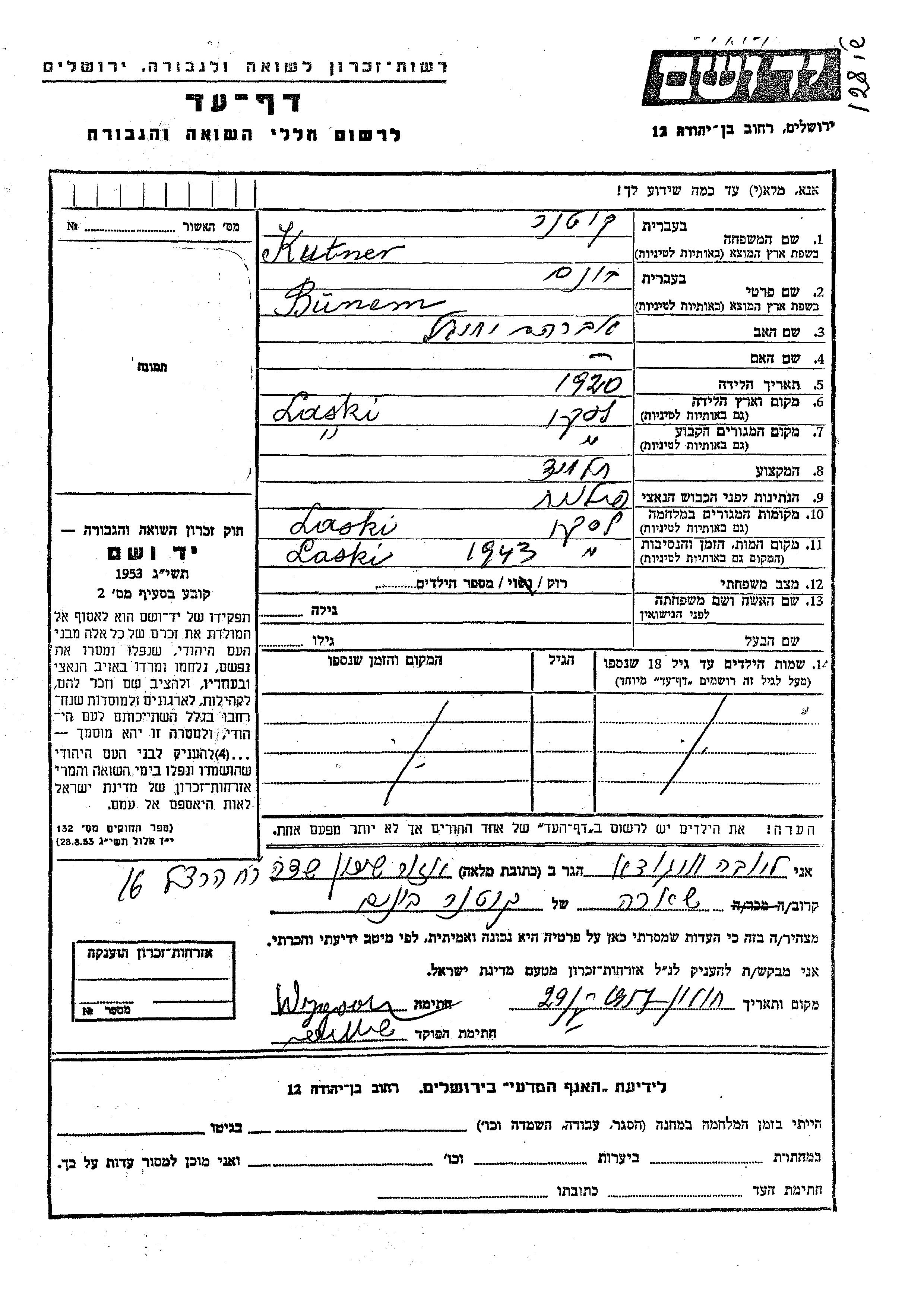 Бунем Кутнер, место рождения: Ласки, Польша. Отец: Авраам Иехиэль. Ученик / ученица. Холост / не замужем. Место жительства до войны: Ласки, Польша. Место во время войны: Ласки, Польша.