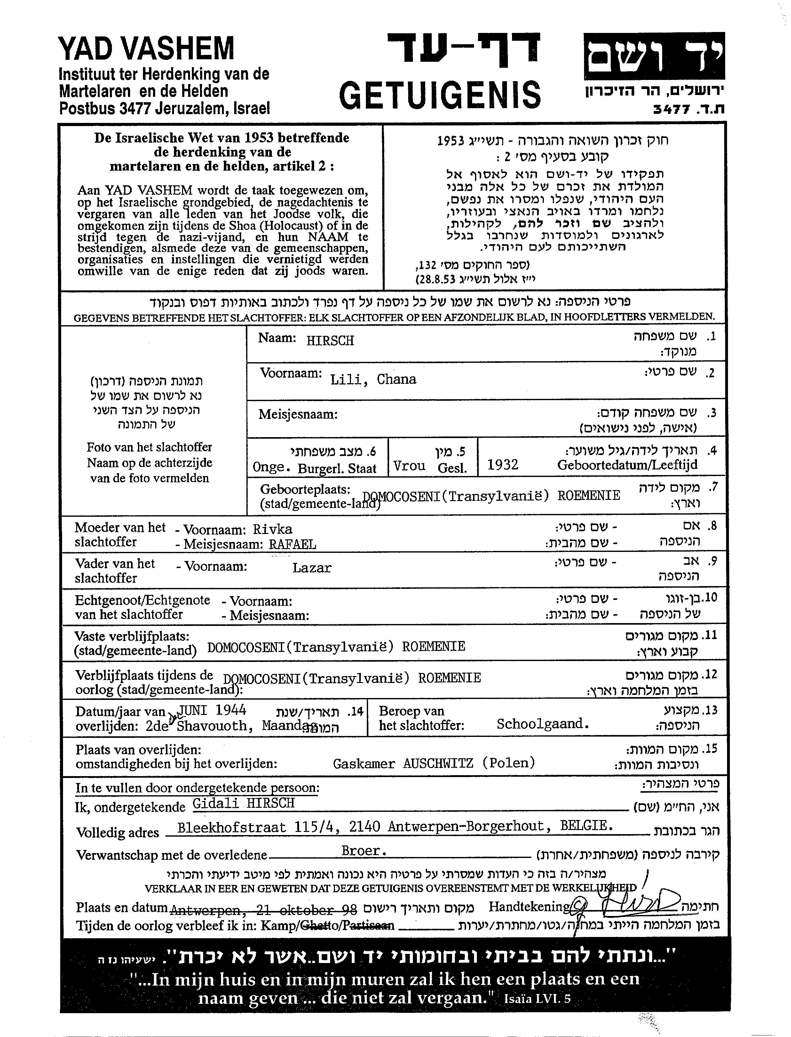 Хирш Лили Хана 1932 Дэмэкушень, Румыния Лист свидетельских показаний