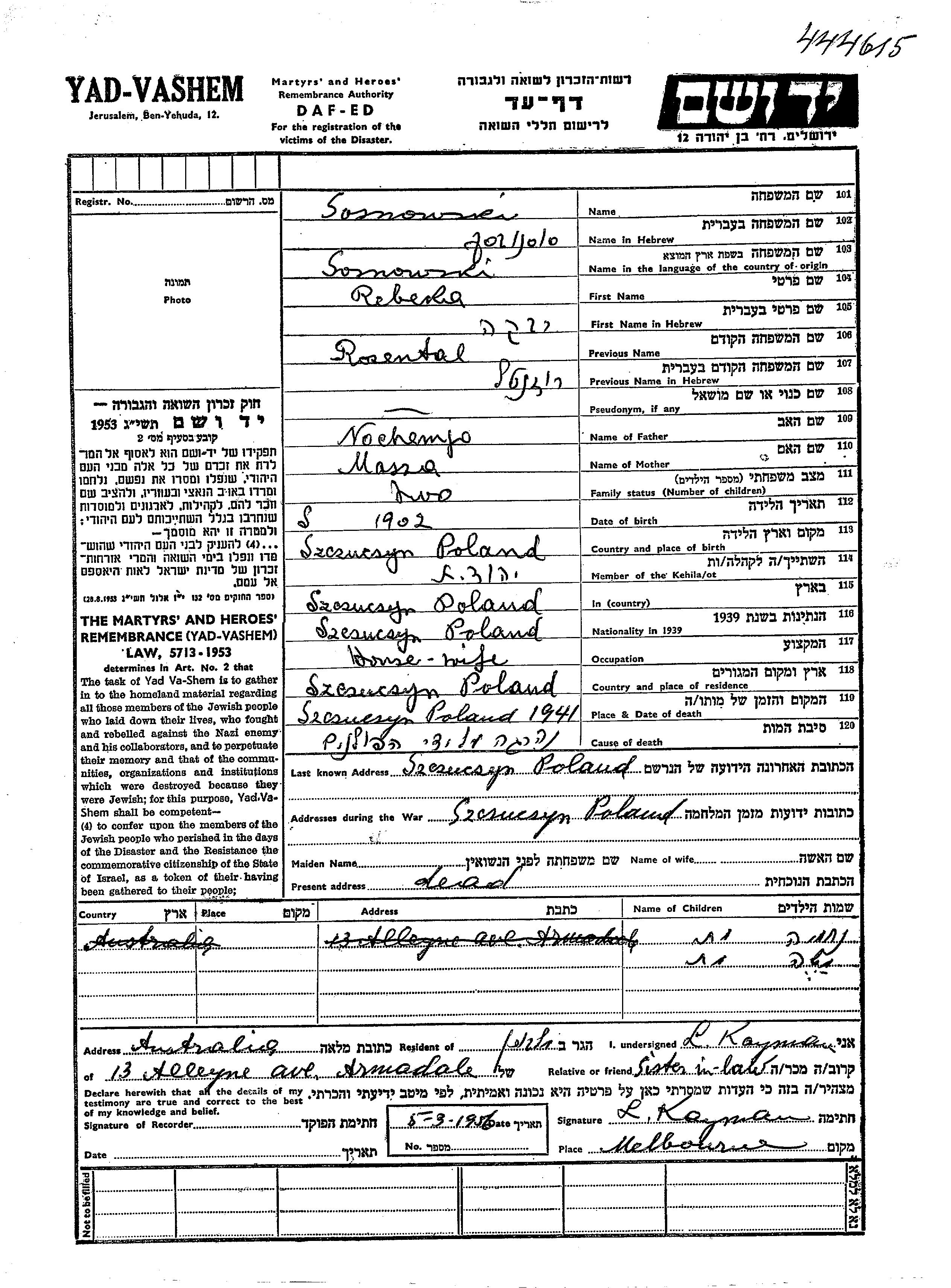Ривка Сосновски, девичья фамилия Розенталь, место рождения: Щучин, Польша. Отец: Нехемия, mать:Маша. Вдова. Место жительства до войны: Щучин, Польша. Место во время войны: Щучин, Польша.