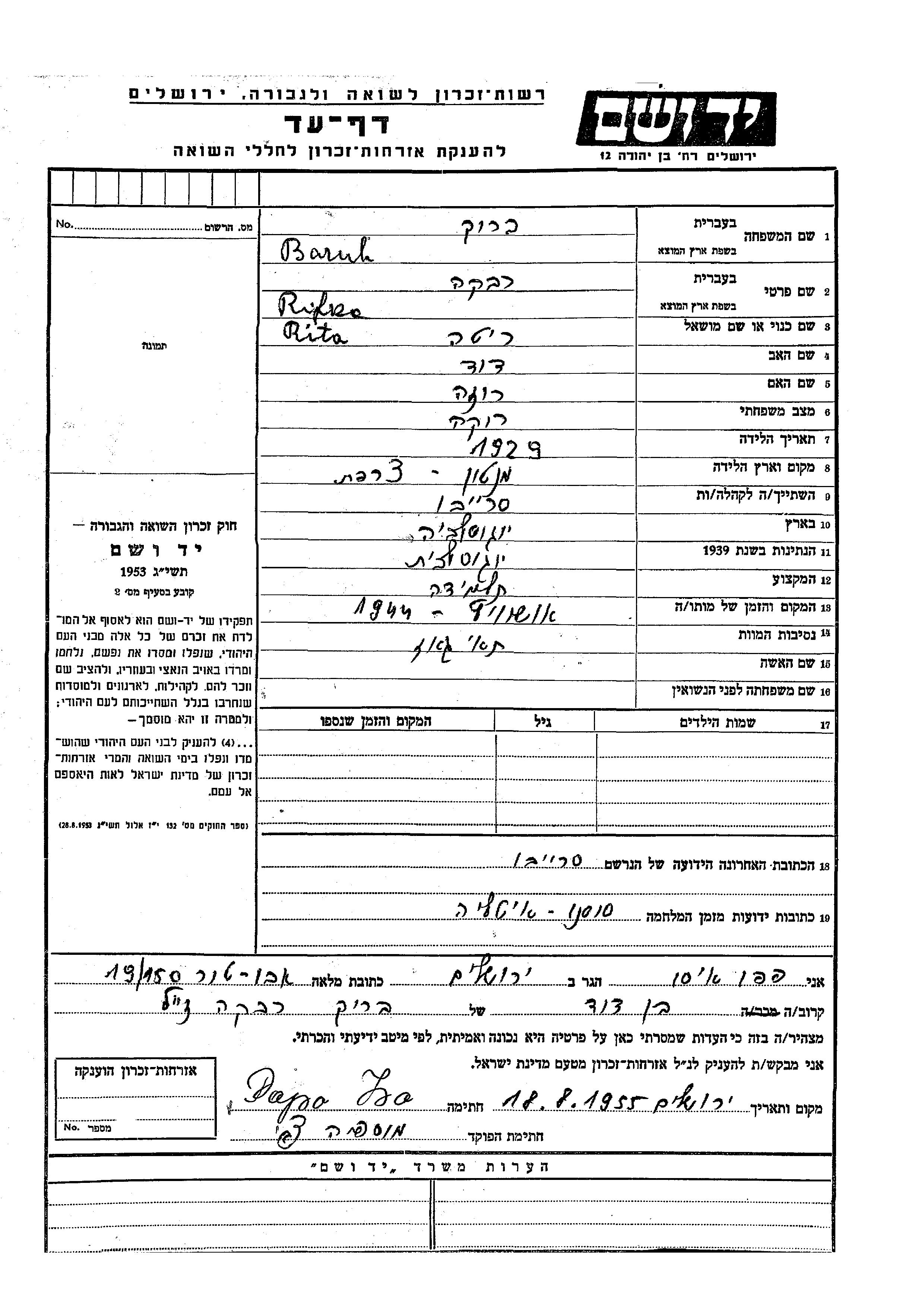 Рифка Рита Барух, место рождения: Ментона, Франция. Отец: Давид, mать:Роза. Ученик / ученица. Холост / не замужем. Место жительства до войны: Сараево, Югославия. Место во время войны: Соссано, Италия.