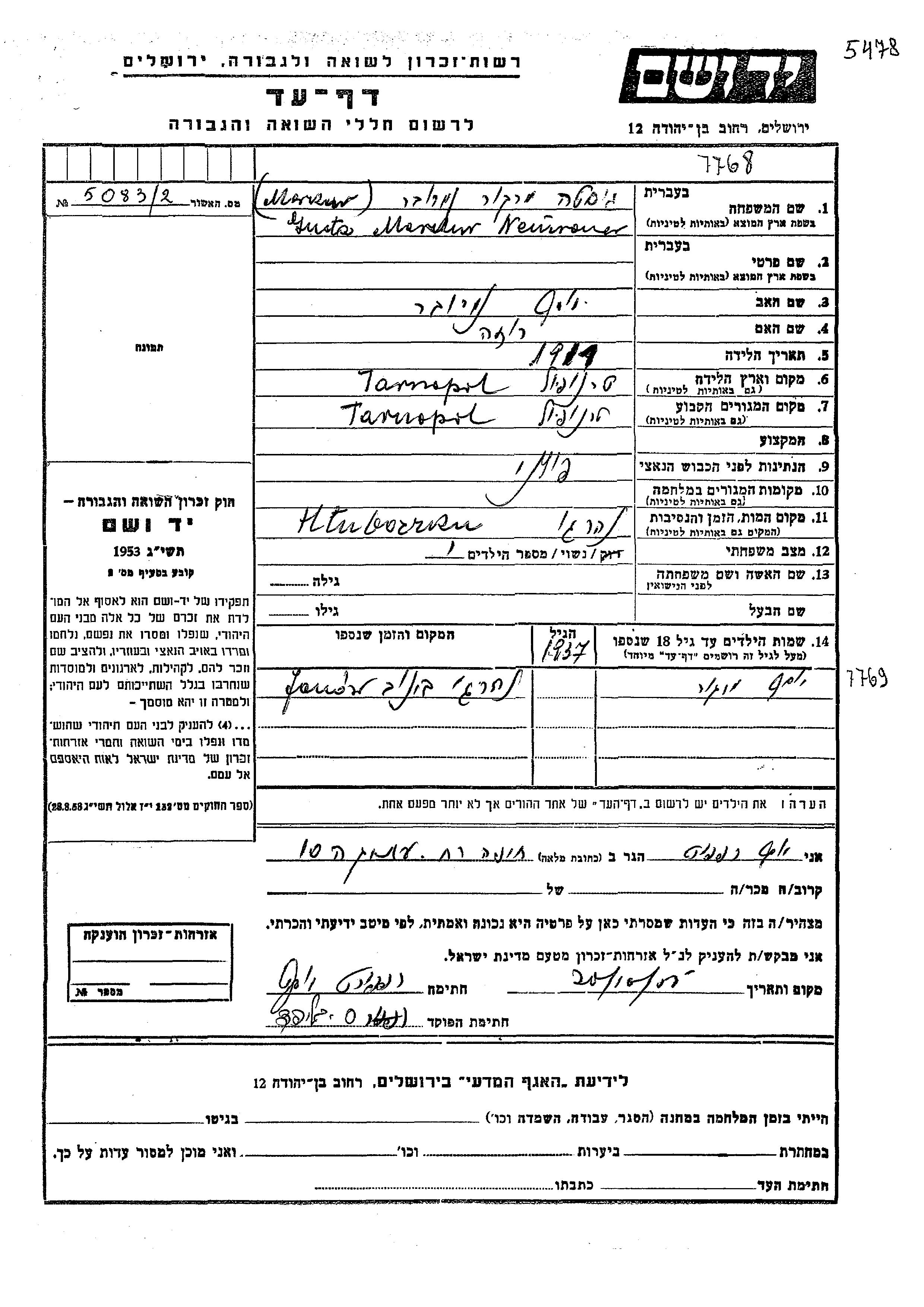 Яд Вашем - Листы свидетельских показаний Мемориального фонда