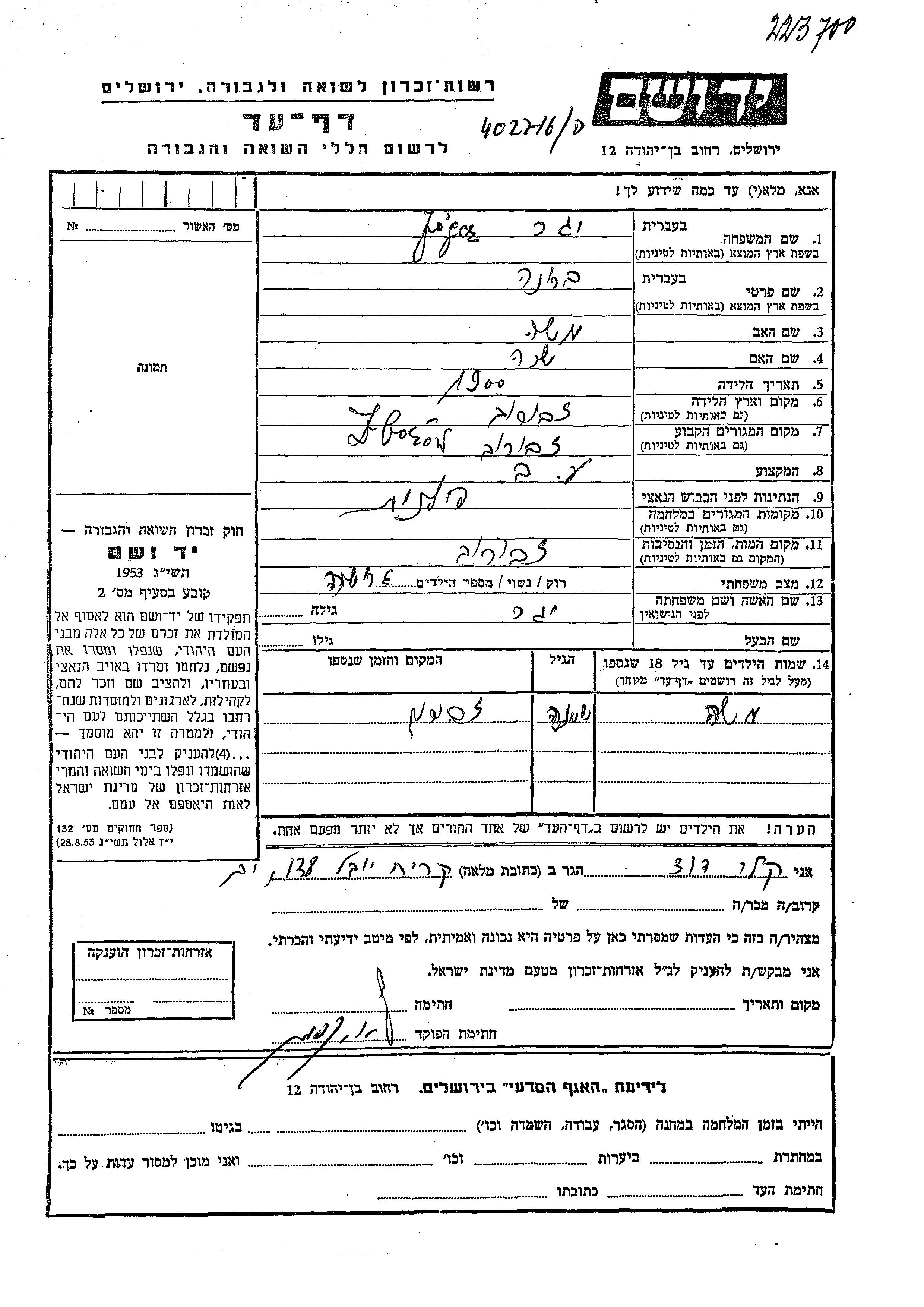 Яд Вашем - Листы свидетельских показаний Мемориального фонда