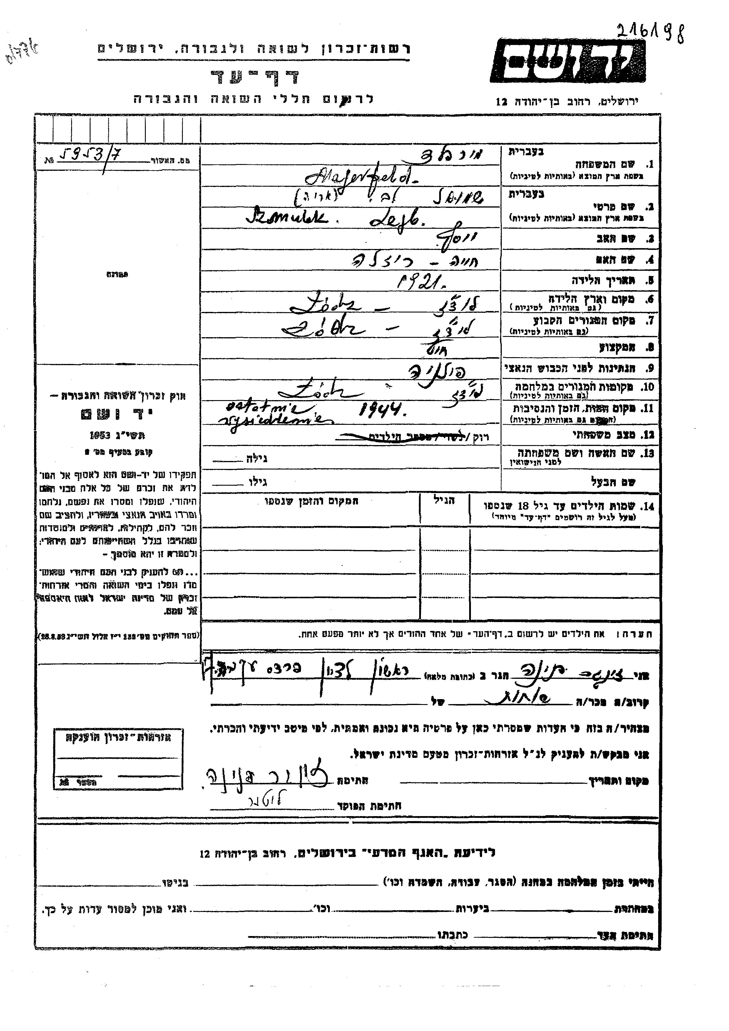 Маерфельд Шмулек Лейб Лев Арье 1921 Лодзь, Польша Лист свидетельских показаний