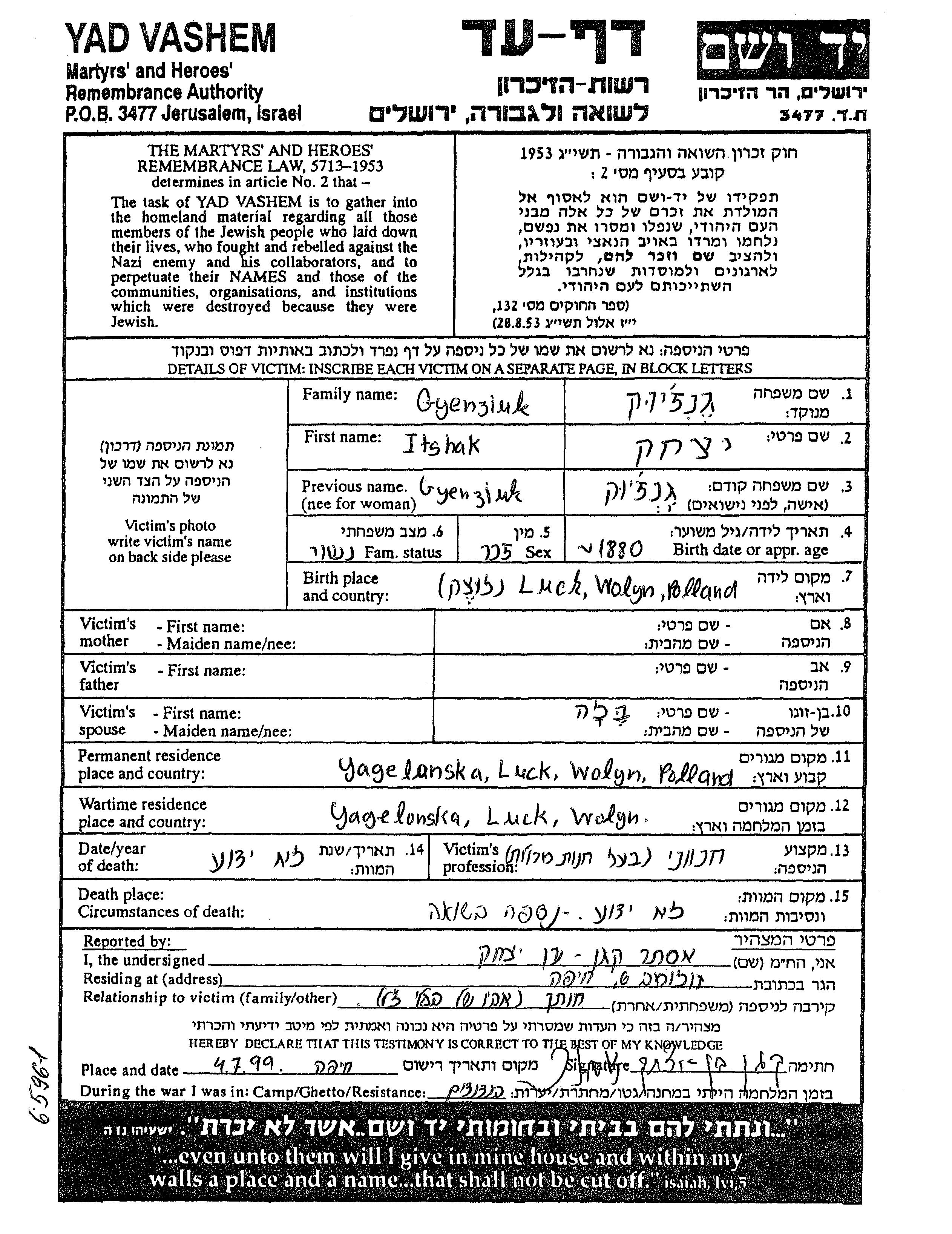 Ицхак Гензюк, место рождения: Луцк, Польша. Бакалейщик / бакалейщица. Женат / замужем.