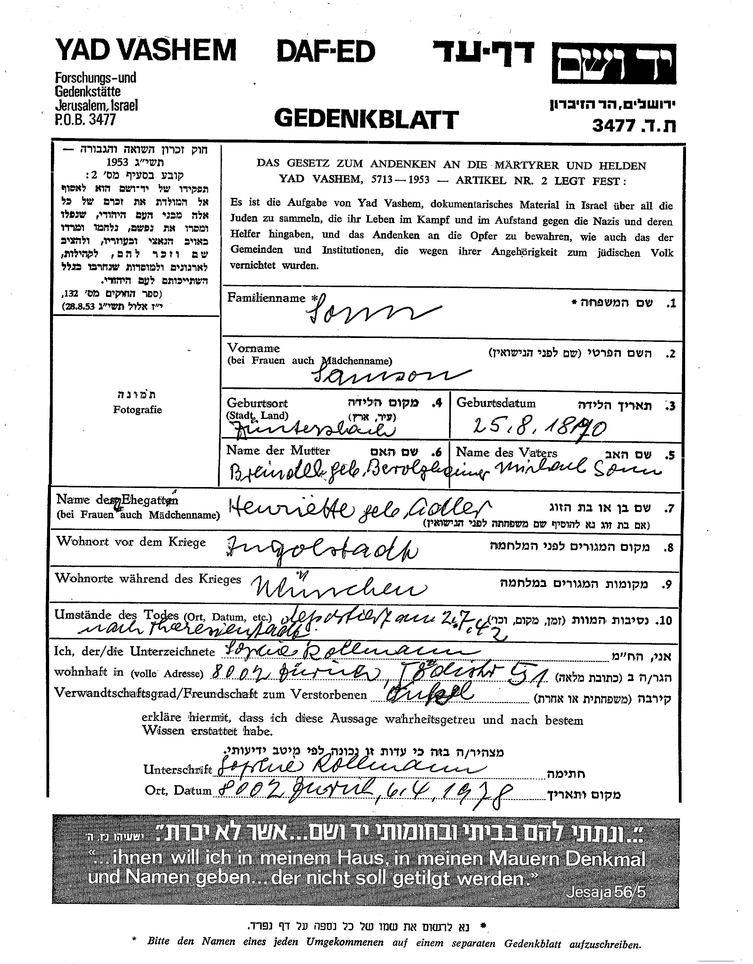 Яд Вашем - Листы свидетельских показаний Мемориального фонда
