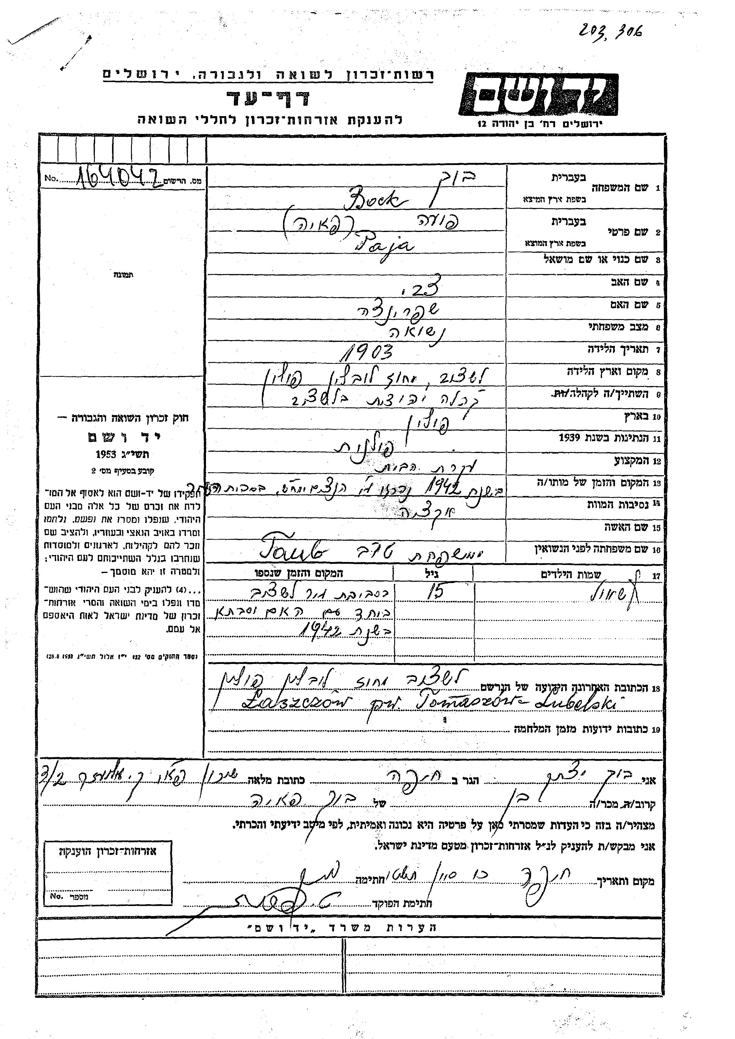 Пая Бок, девичья фамилия Тауб, место рождения: Лащув, Польша. Отец: Цви, mать:Шпринца. Домохозяйка. Женат / замужем. Место жительства до войны: Лащув, Польша. Место во время войны: Лащув, Польша.