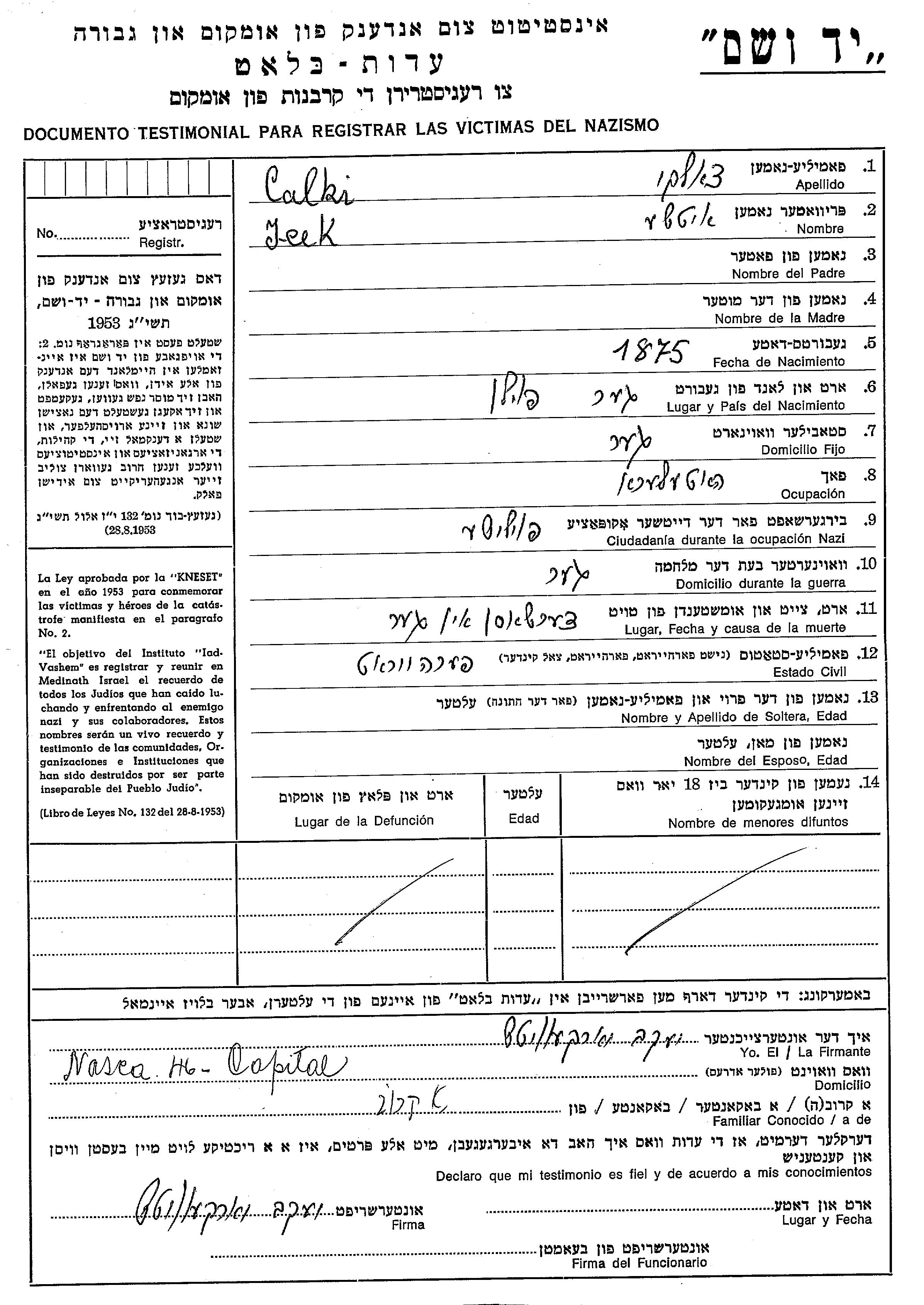 Ицек Цалки, место рождения: Гора-Кальвария, Польша. האטעלערא. Женат / замужем. Место жительства до войны: Гора-Кальвария, Польша. Место во время войны: Гора-Кальвария, Польша.