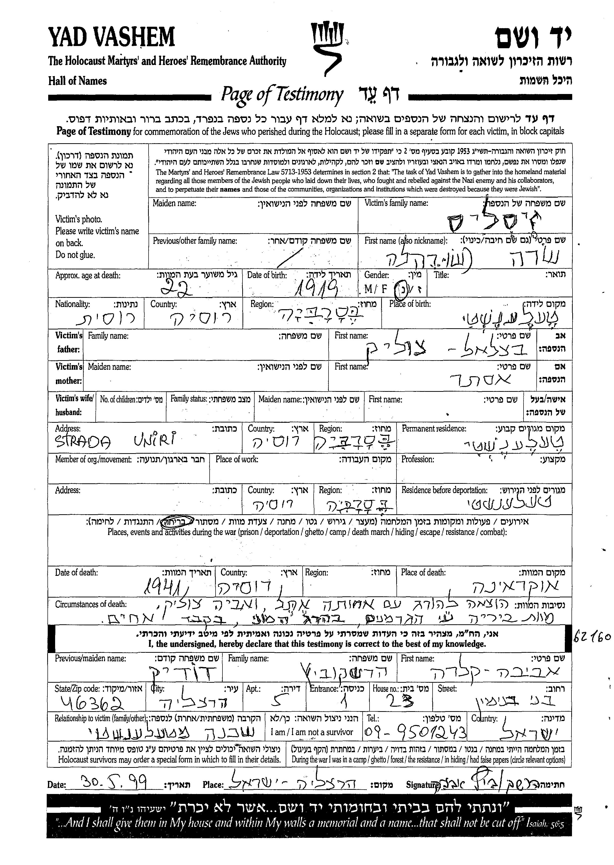 Зислис Сара 1919 Теленешты, Румыния Лист свидетельских показаний