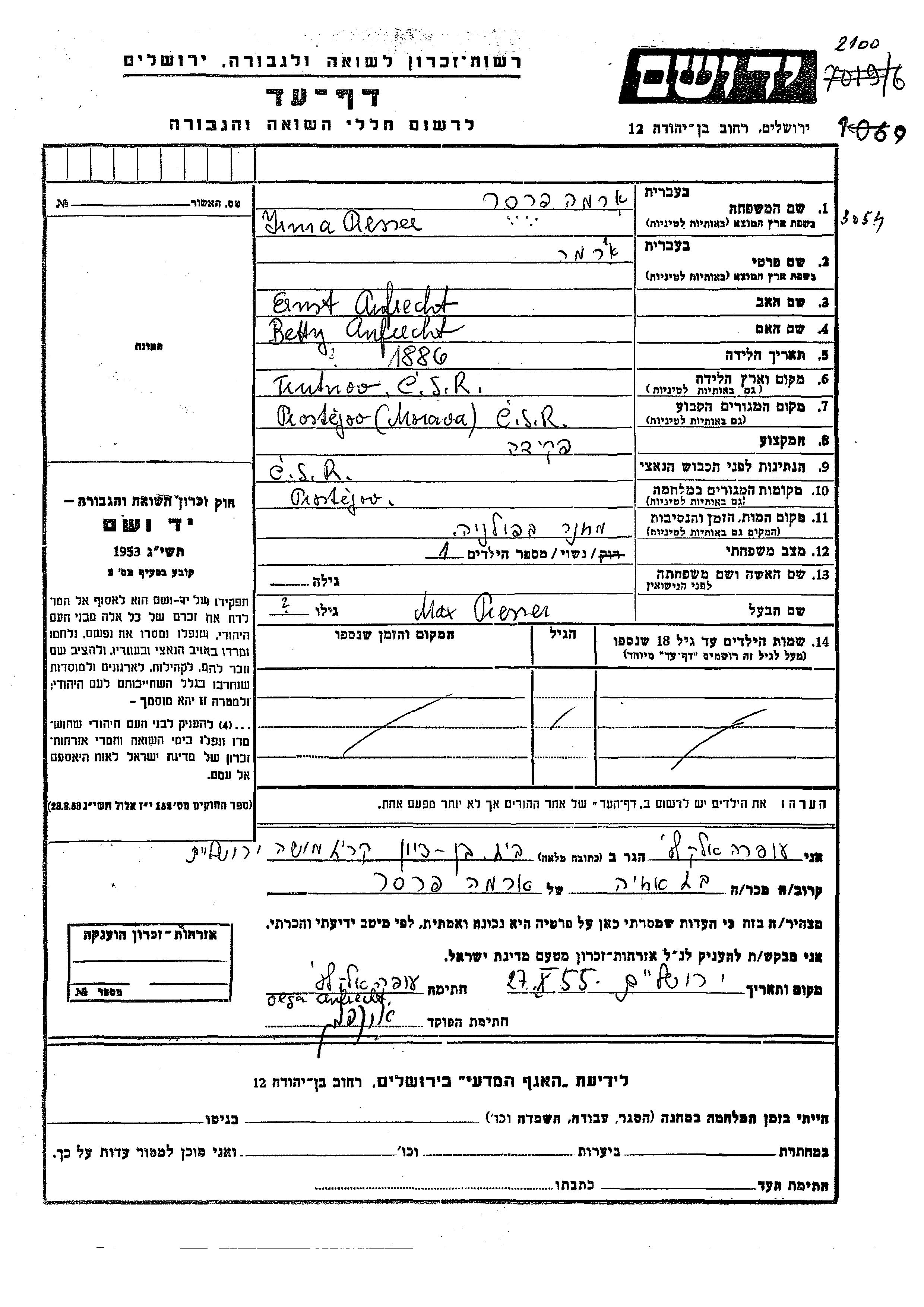 Яд Вашем - Листы свидетельских показаний Мемориального фонда