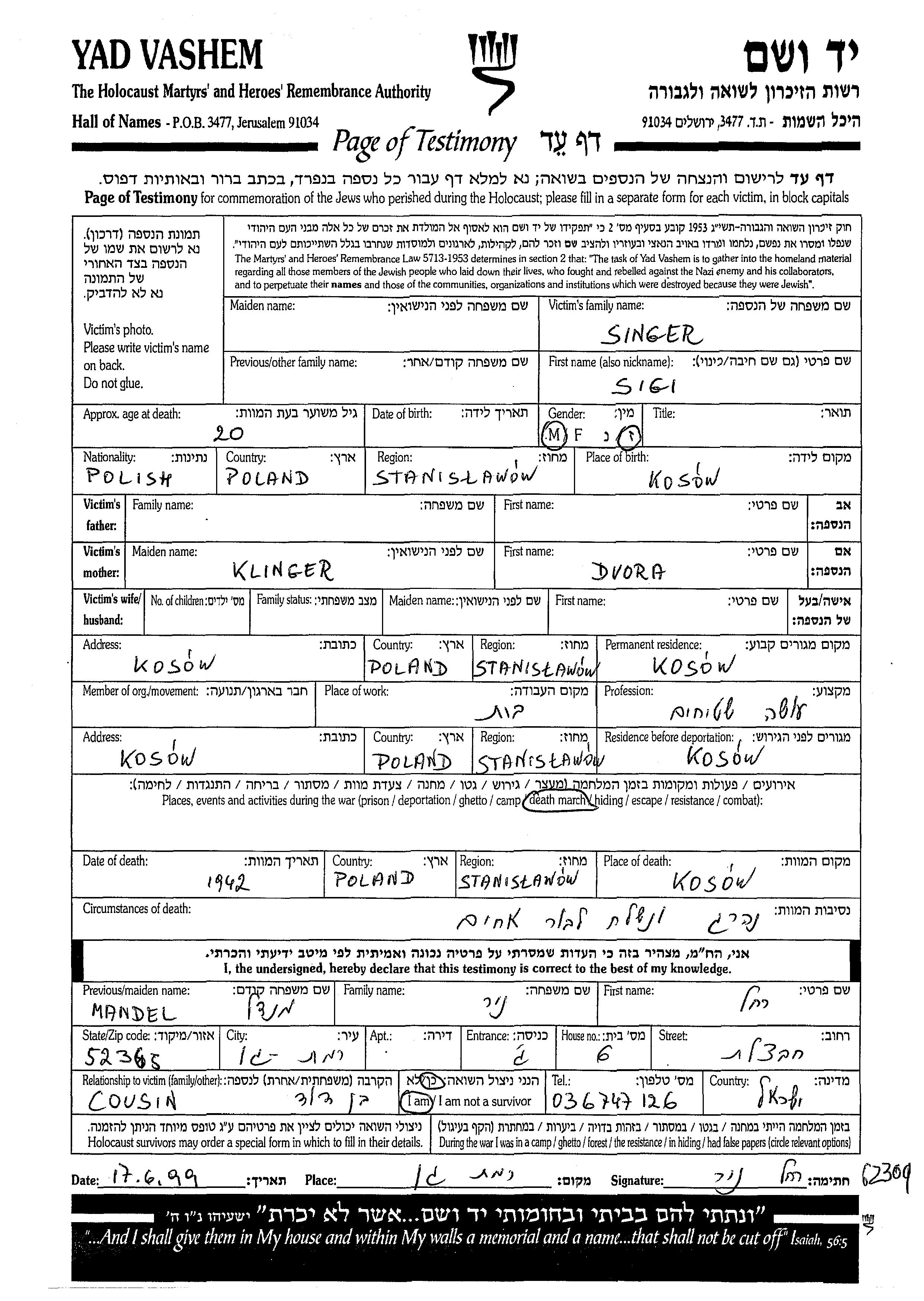 Зингер Зиги Косов Покуцкий, Польша Лист свидетельских показаний