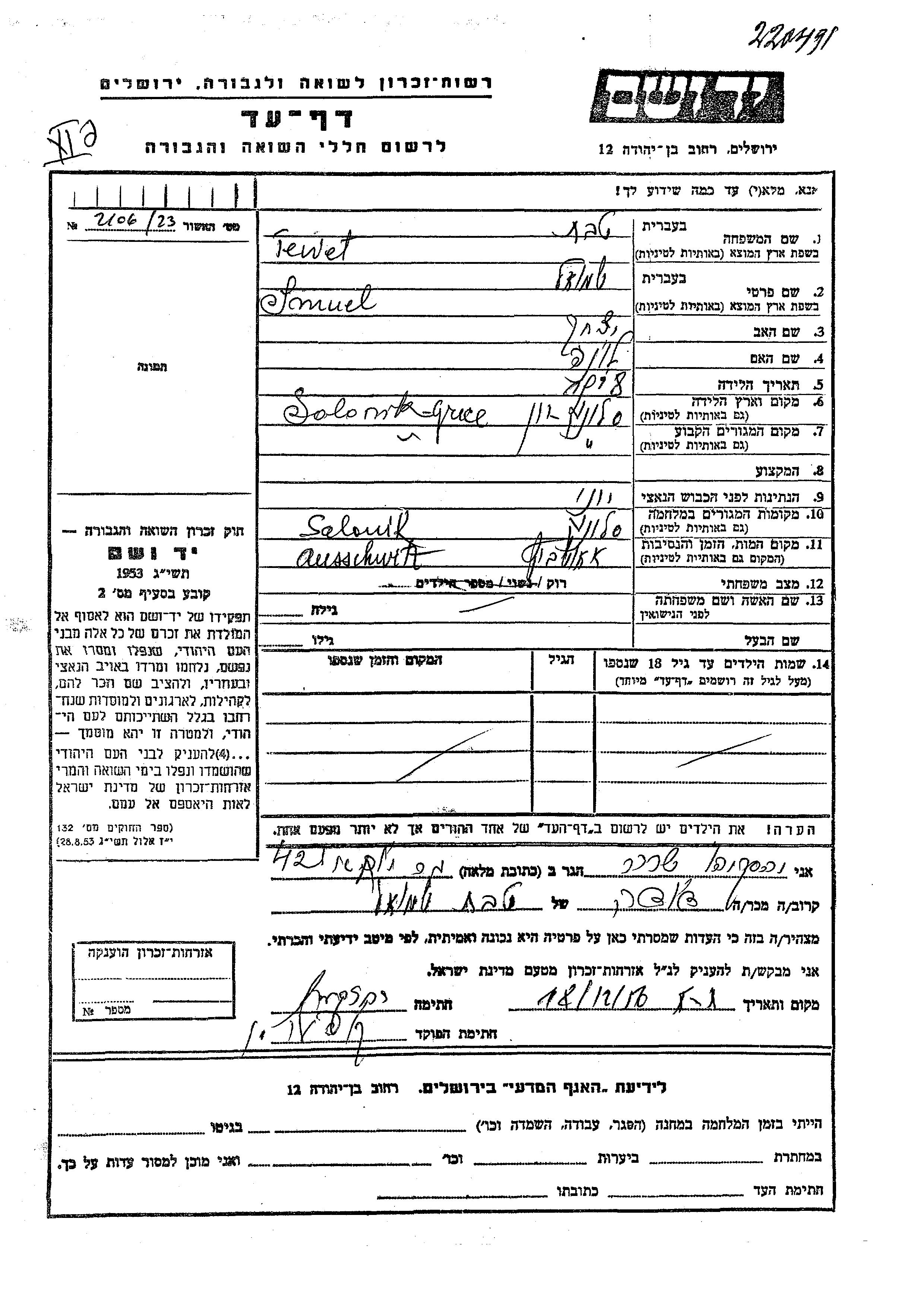 Тевет Шмуэль 1918 Салоники, Греция Лист свидетельских показаний