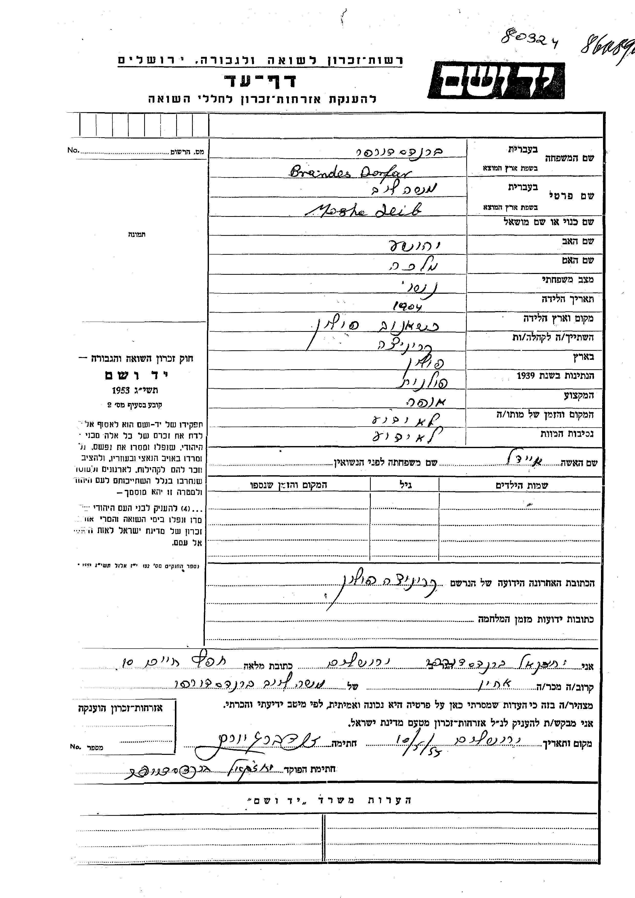 Брандесдорфер Моше Лейб 1904 место не указано, Лист свидетельских показаний