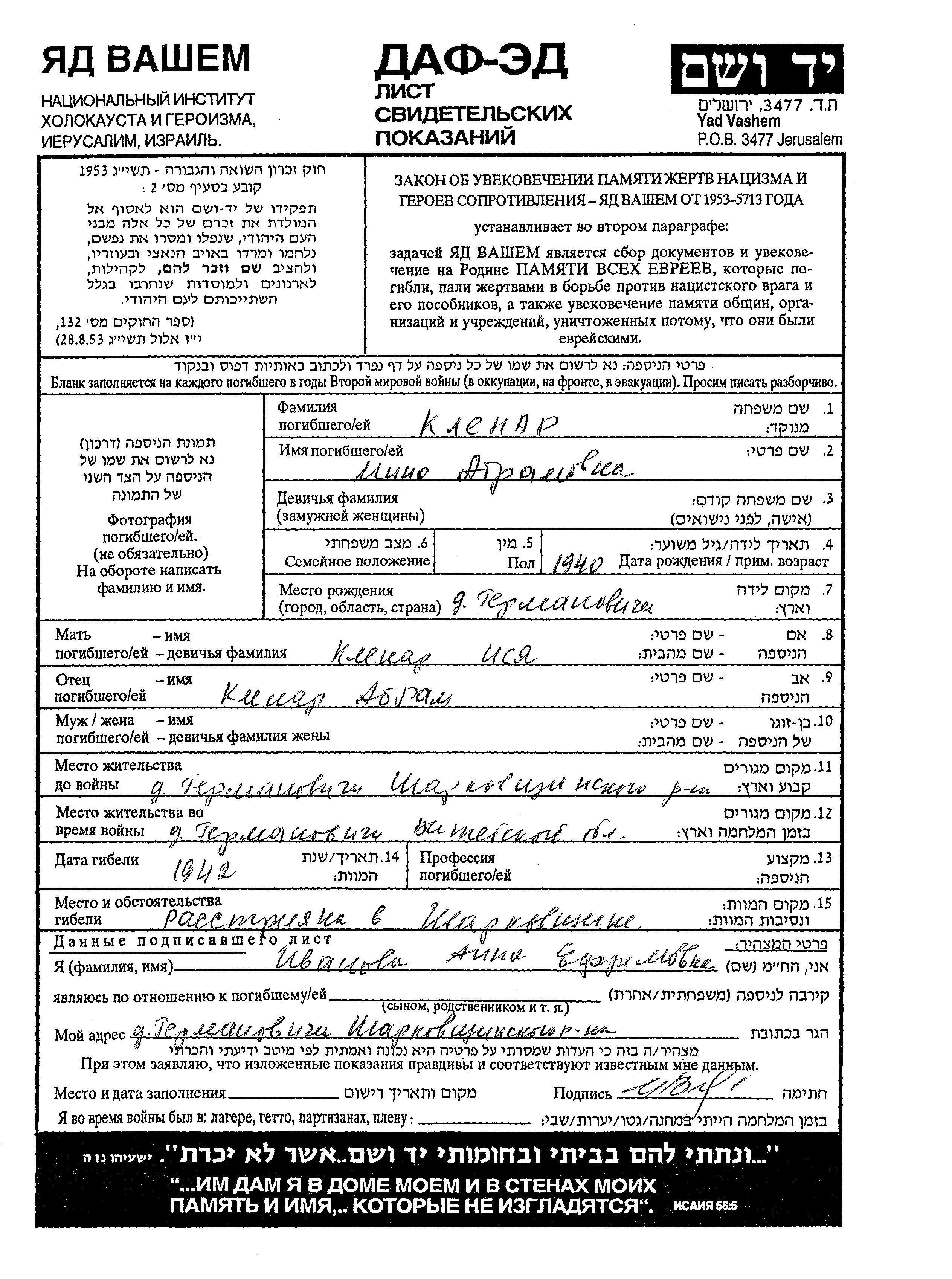 Кленар Инна 1940 Германовичи, Польша Лист свидетельских показаний