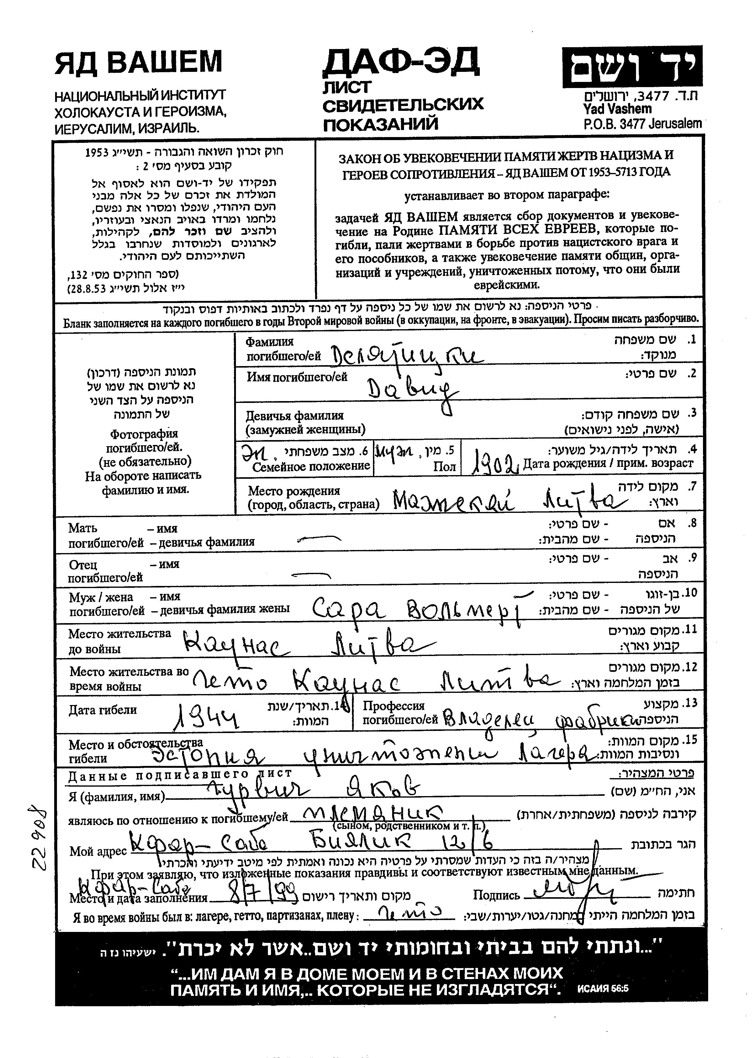 Яд Вашем - Листы свидетельских показаний Мемориального фонда