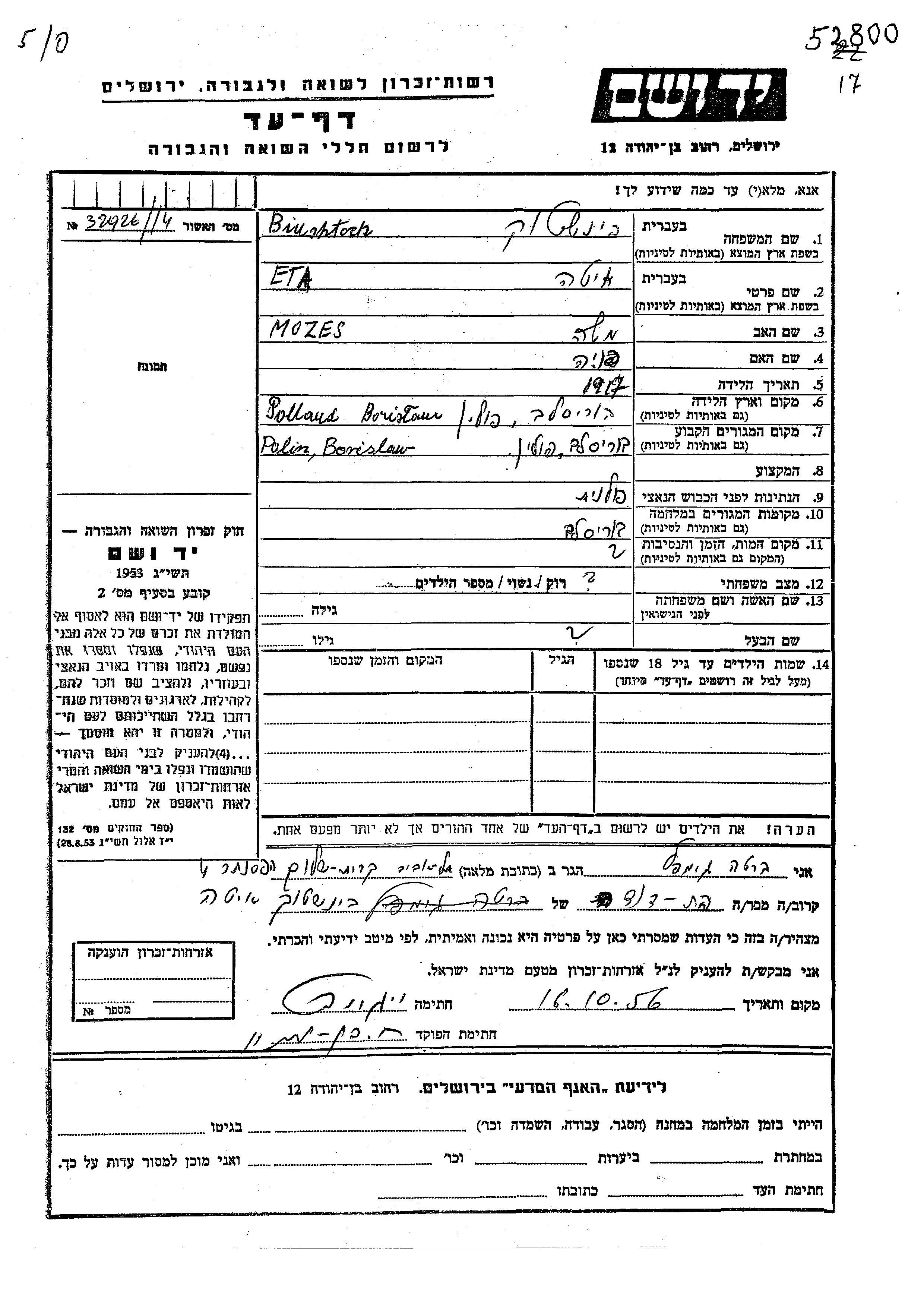 Ита Эта Биншток, место рождения: Борислав, Польша. Отец: Моше, mать:Фаня. Место жительства до войны: Борислав, Польша. Место во время войны: Борислав, Польша.