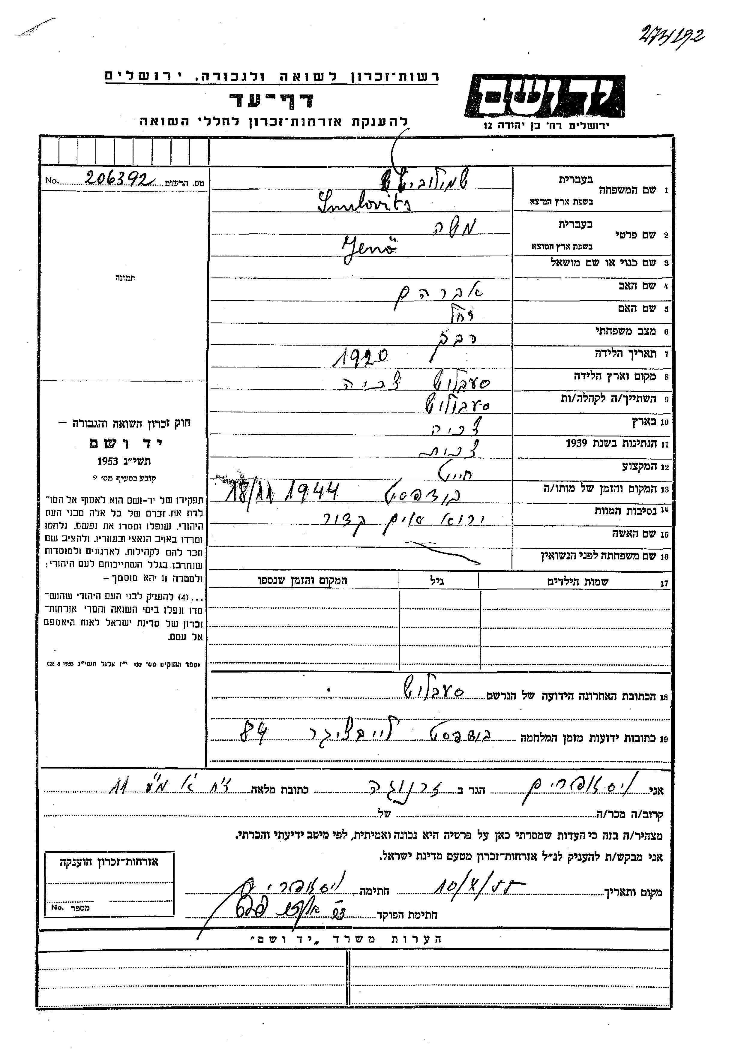 Яд Вашем - Листы свидетельских показаний Мемориального фонда