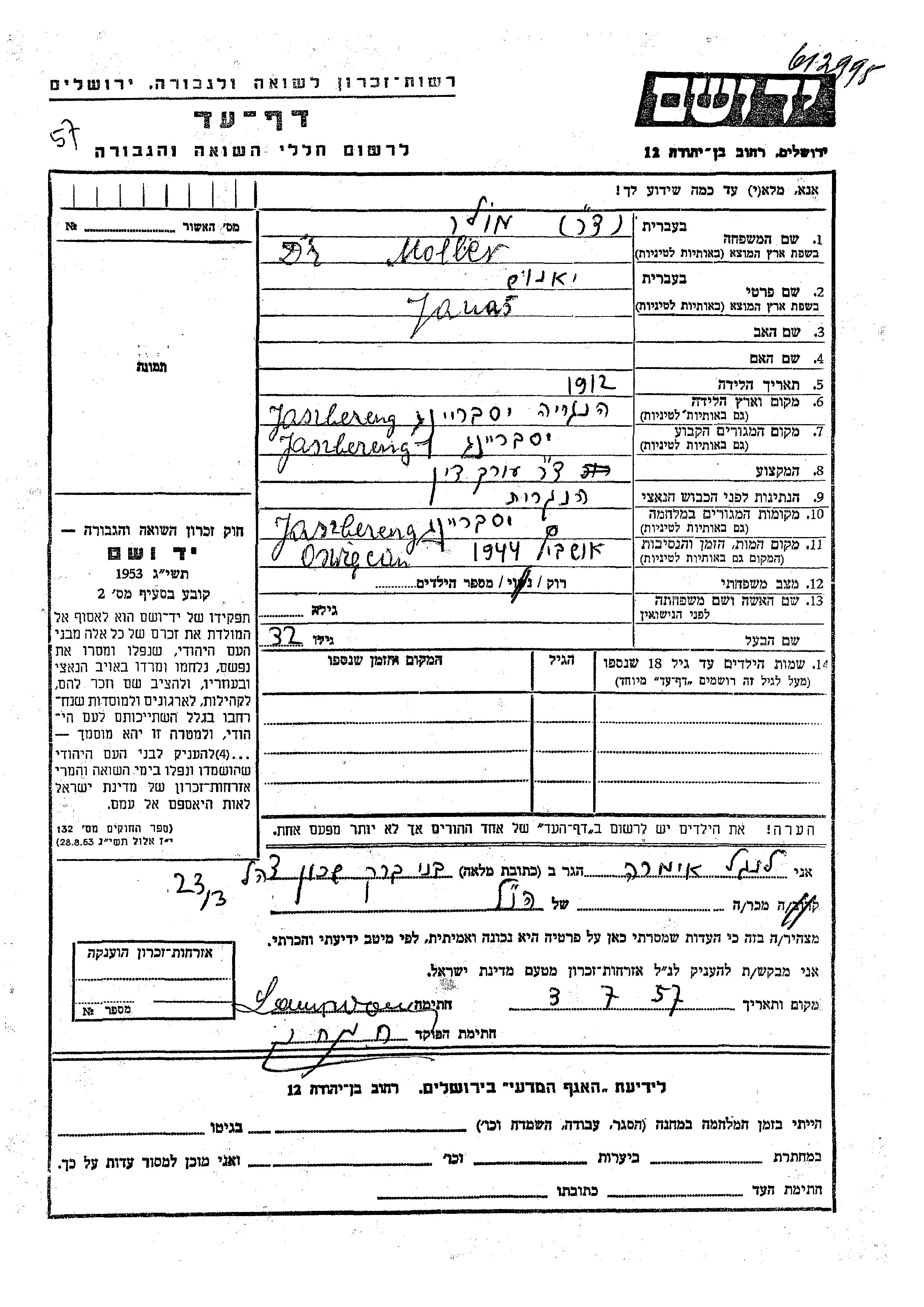 Яд Вашем - Листы свидетельских показаний Мемориального фонда