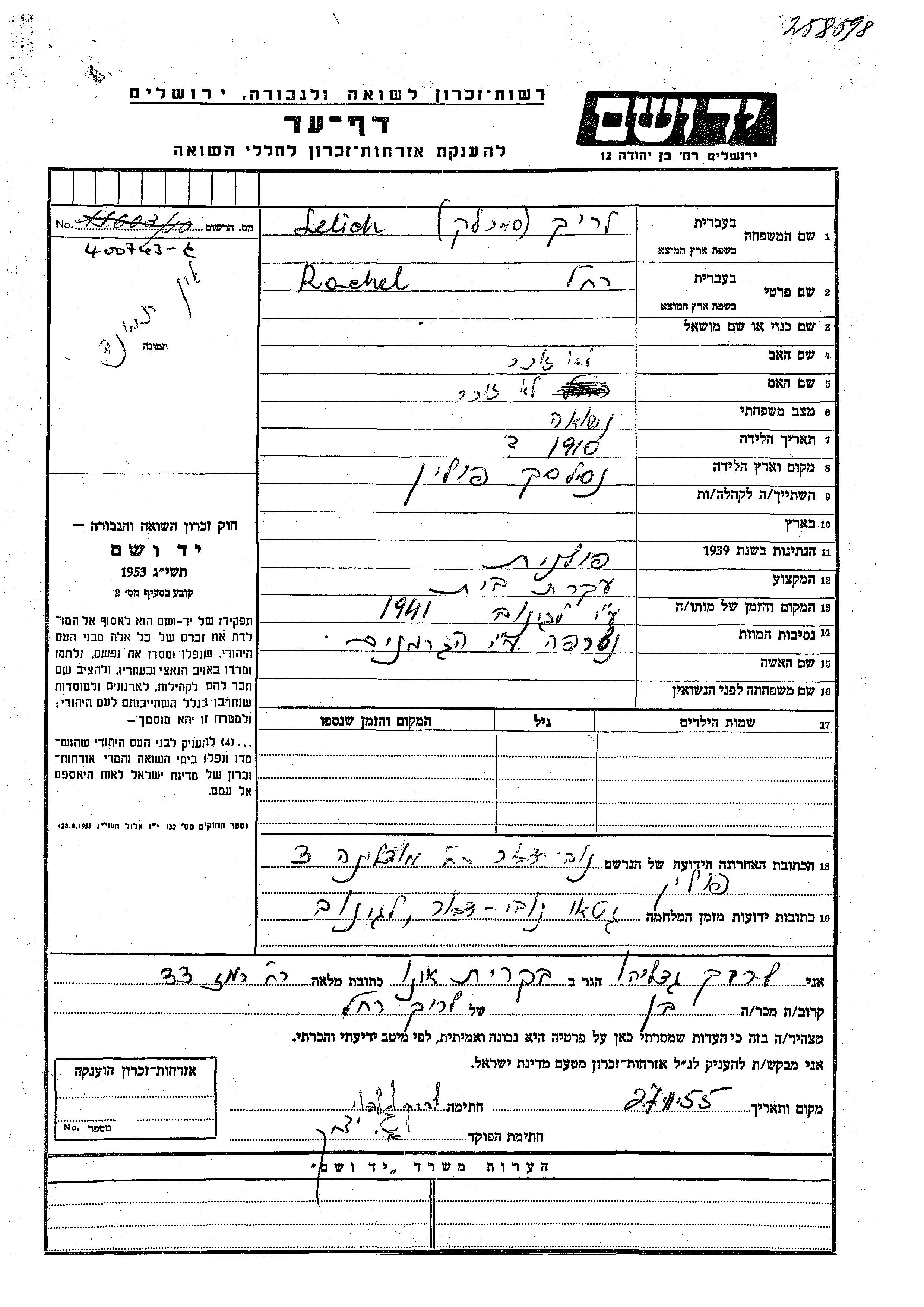 Рахель Лерих, девичья фамилия Смерлак, место рождения: Насельск, Польша. Домохозяйка. Женат / замужем. Место во время войны: Новый Двор, Польша.