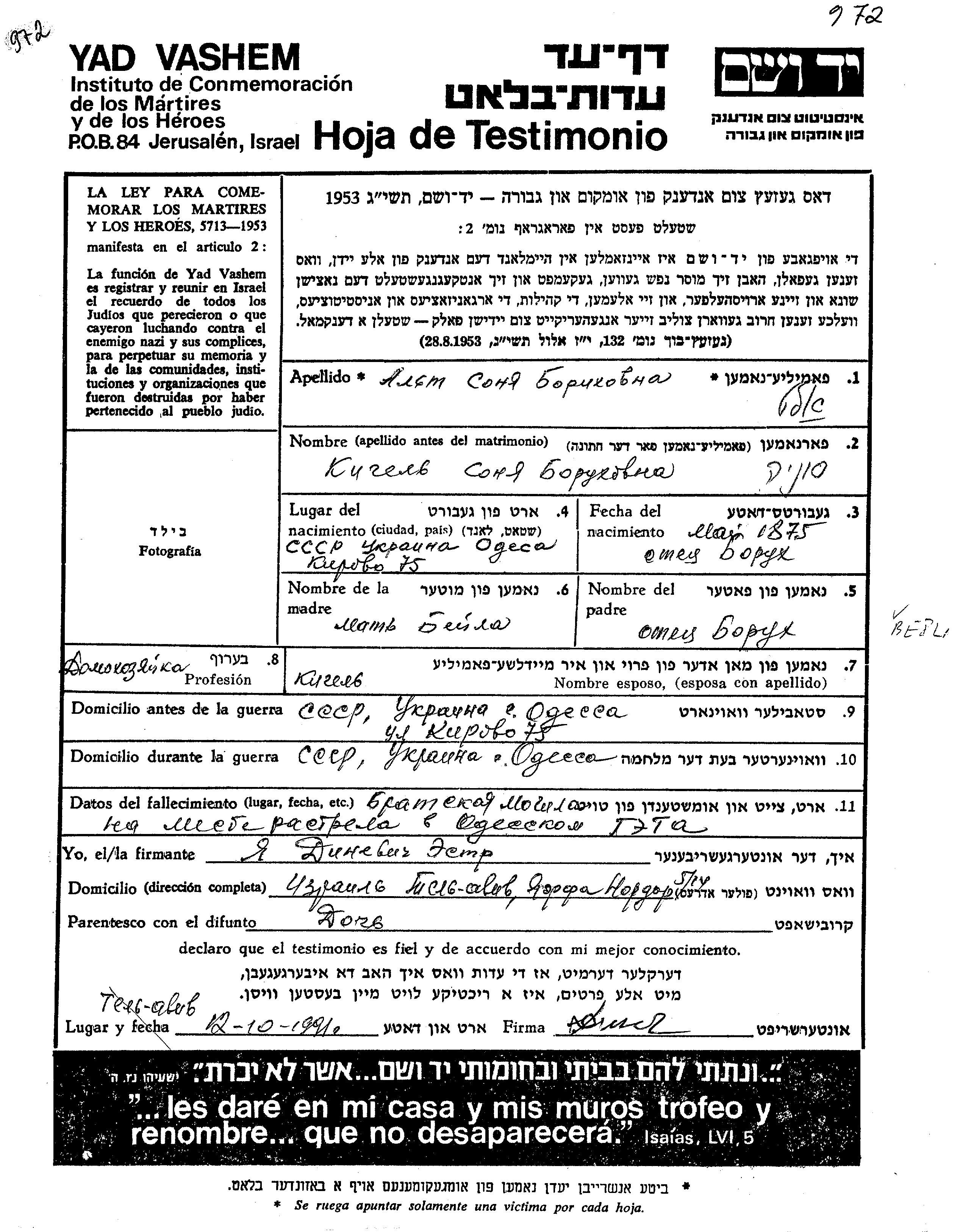 Альт Соня 1875 Одесса, Украина (СССР) Лист свидетельских показаний