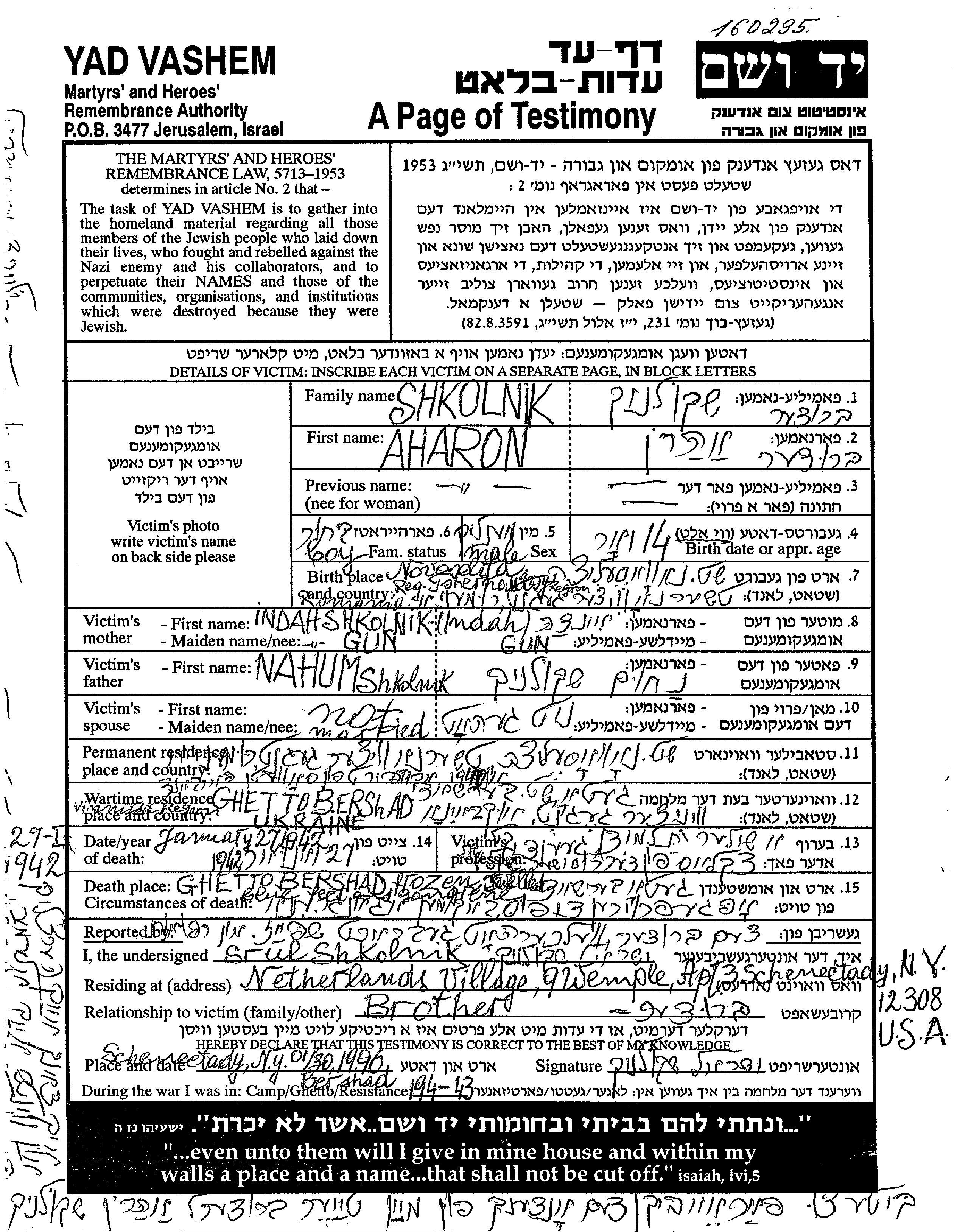 Арон Школьник, место рождения: Новоселица, Румыния. Отец: Нахум, mать:Хинда, девичья фамилия Гун. Ученик / ученица. Ребенок. Место жительства до войны: Новоселица, Румыния. Место во время войны: Бершадь, Украина (СССР).