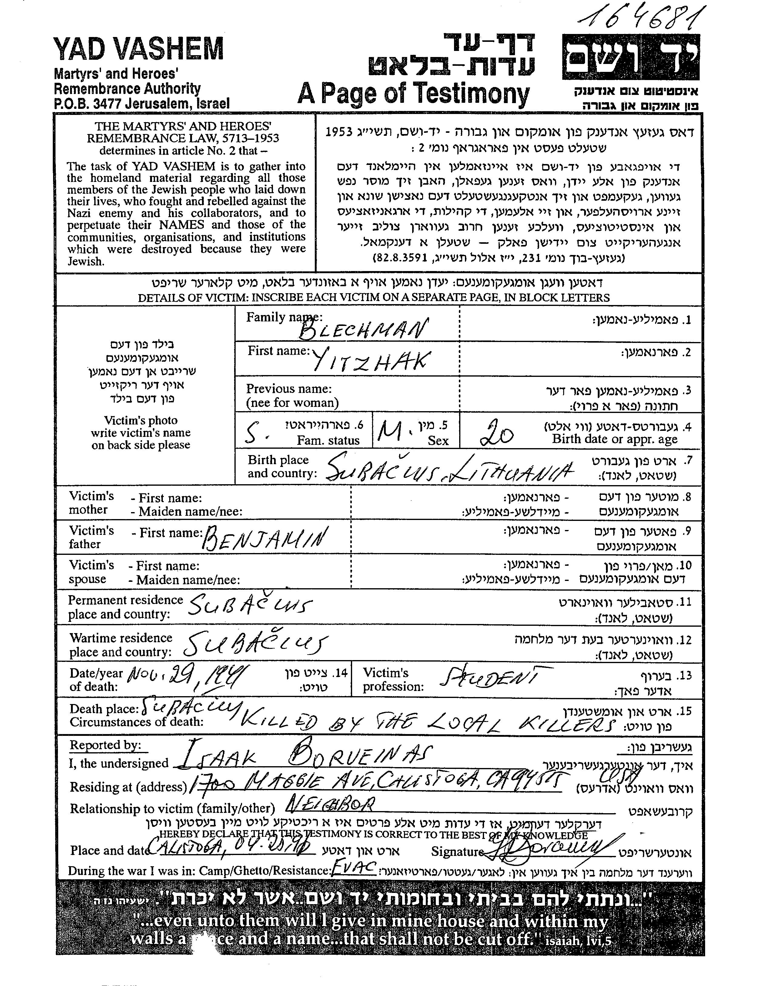 Блехман Ицхак 1921 Субачюс, Литва Лист свидетельских показаний