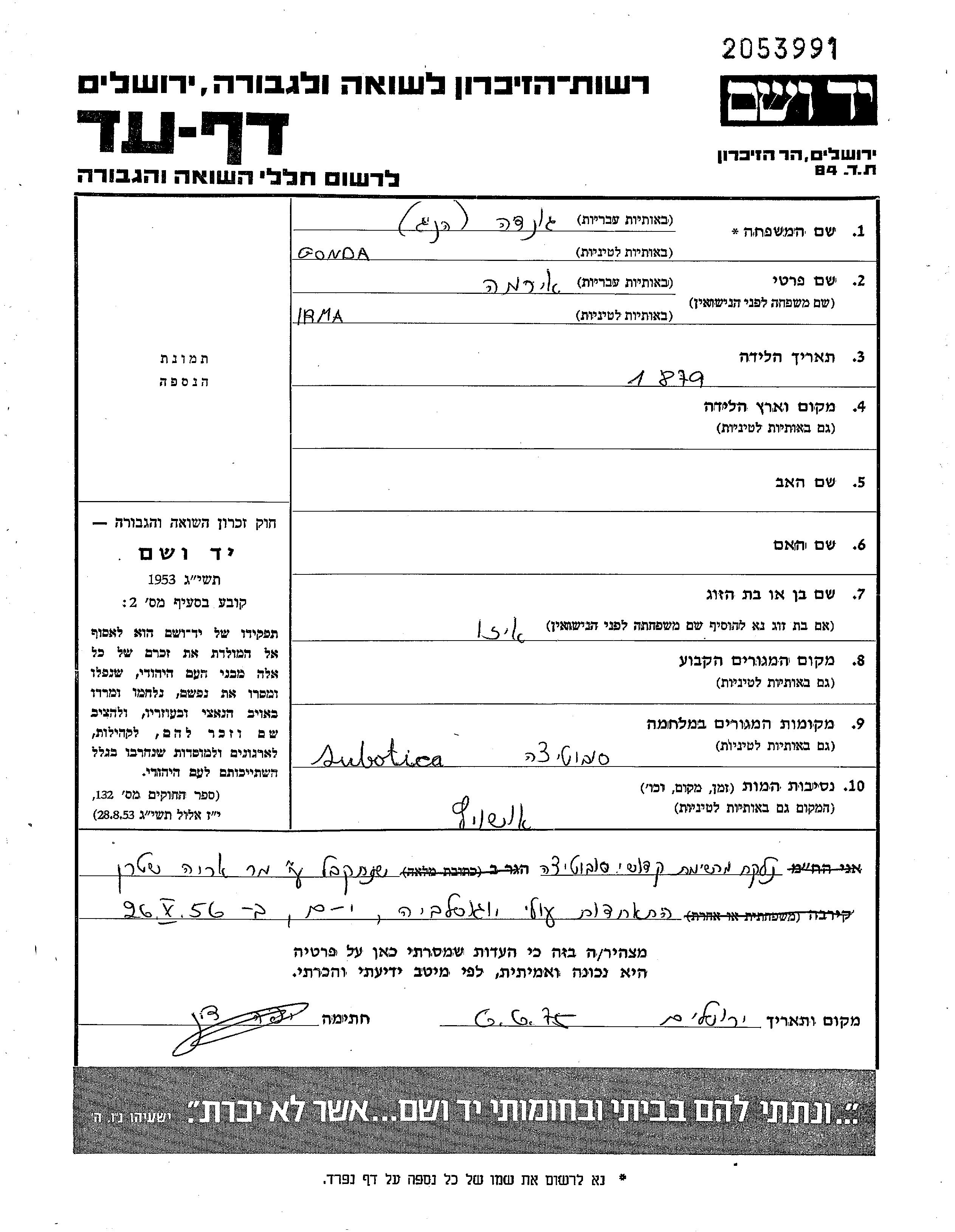 Гонда Ирма Суботица, Югославия Лист свидетельских показаний