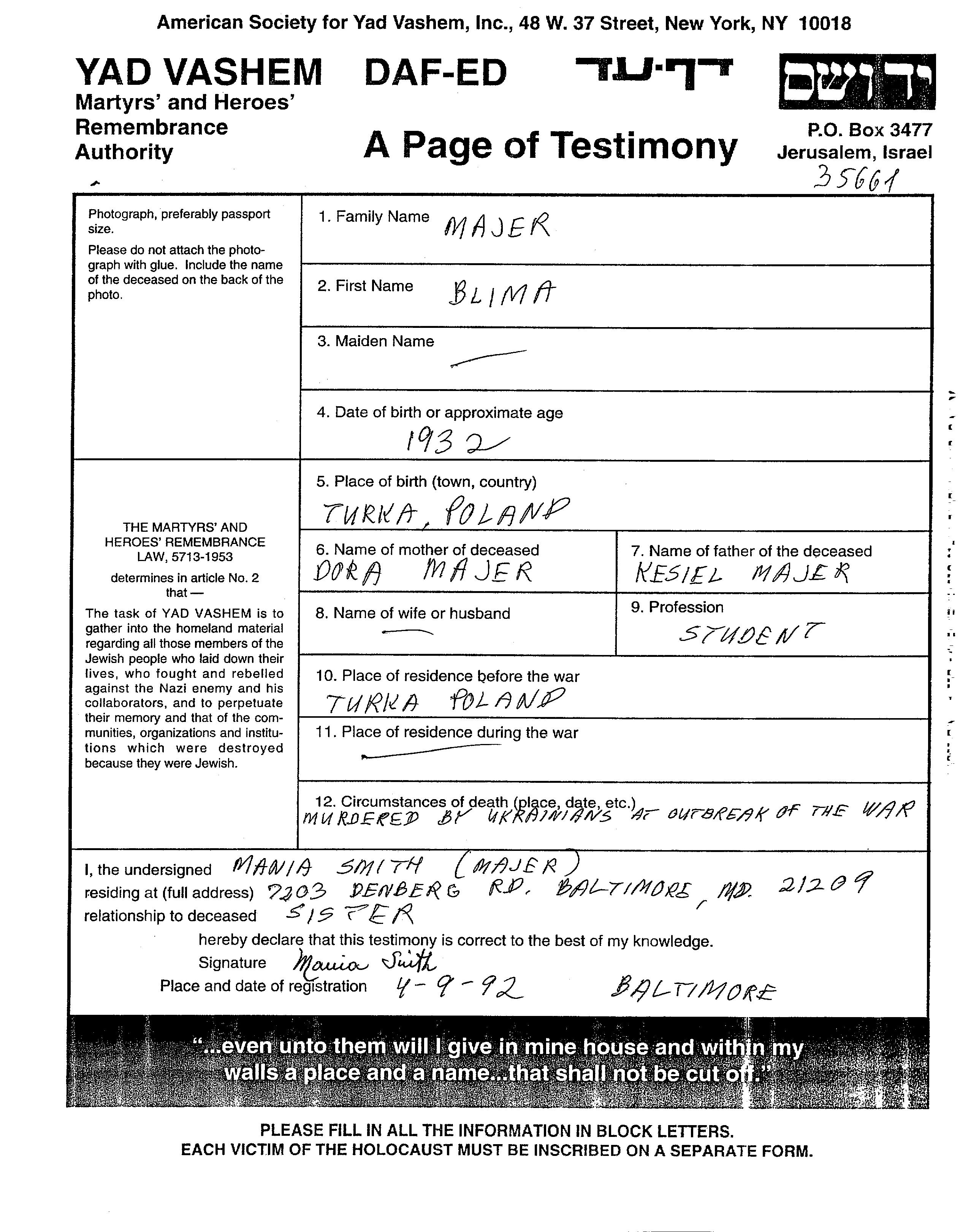 Маер Блима 1932 Турка, Польша Лист свидетельских показаний