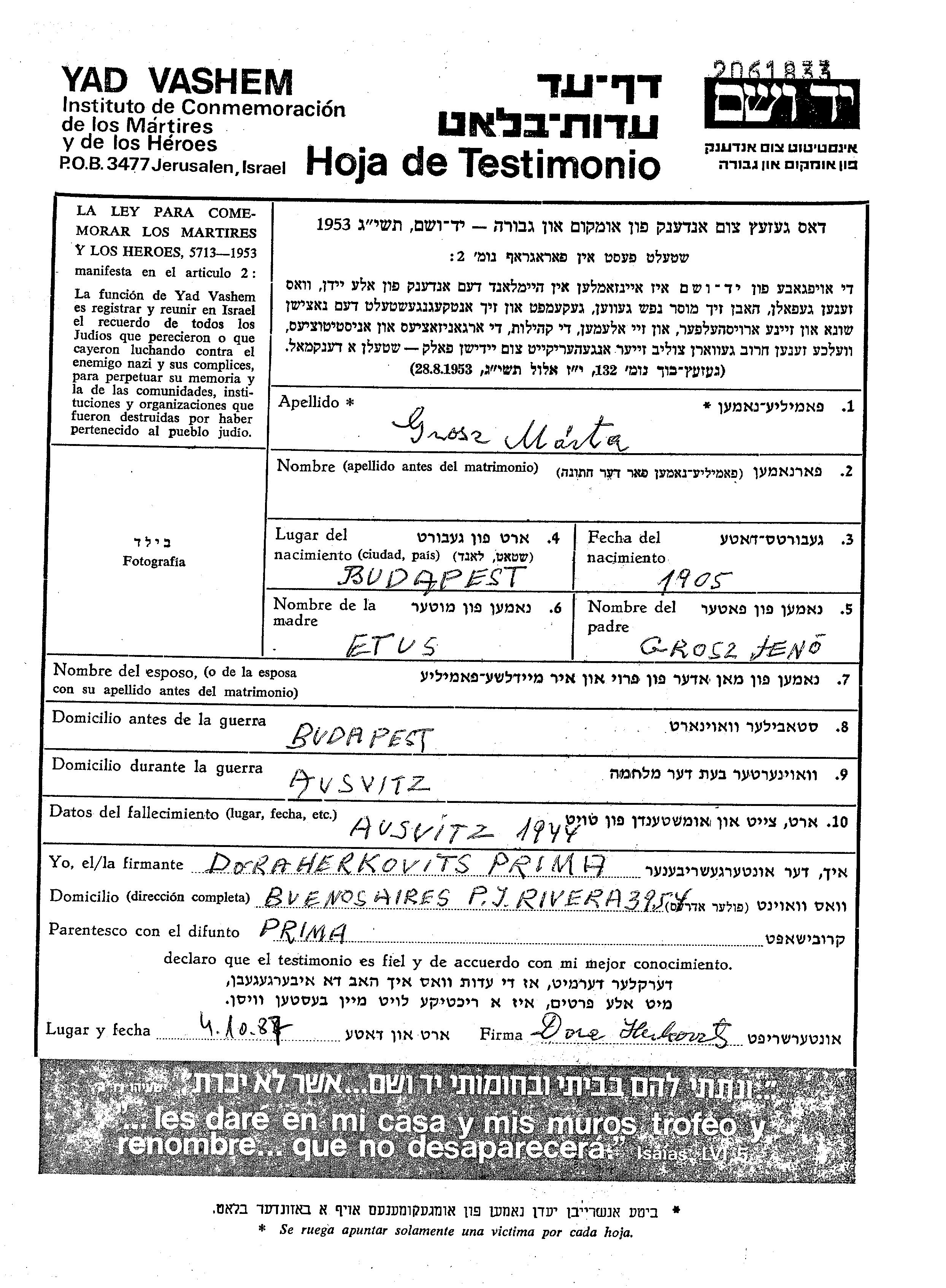 Марта Грос, место рождения: Будапешт, Венгрия. Отец: Ено, mать:Этуш. Место жительства до войны: Будапешт, Венгрия.