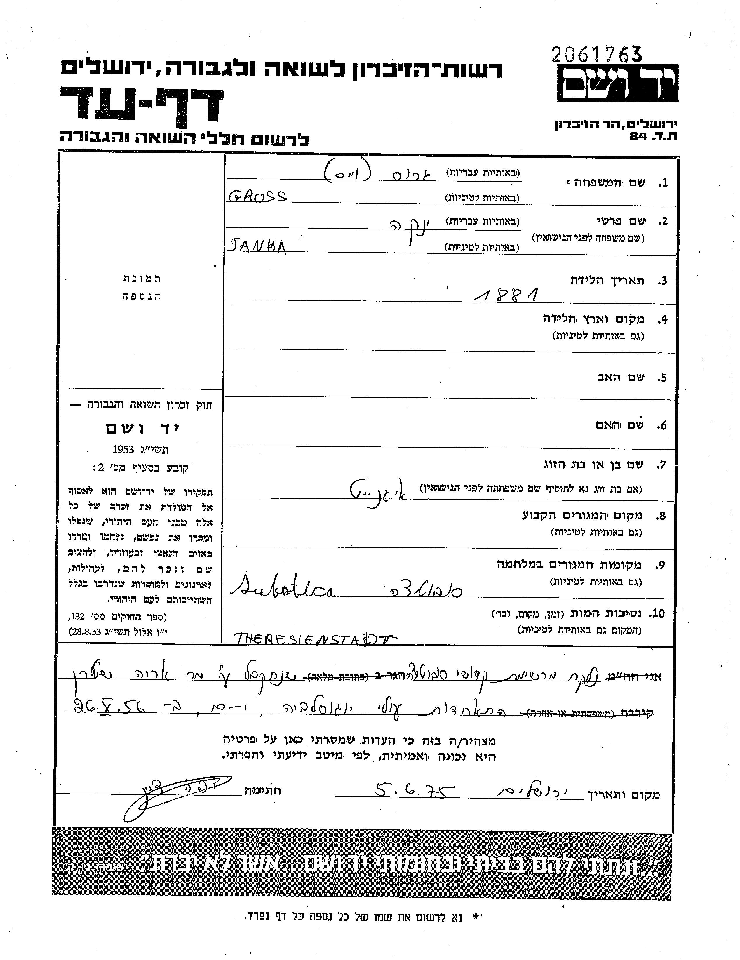 Янка Гросс, девичья фамилия Вайс. Женат / замужем. Место жительства до войны: Суботица, Югославия. Место во время войны: Суботица, Югославия.