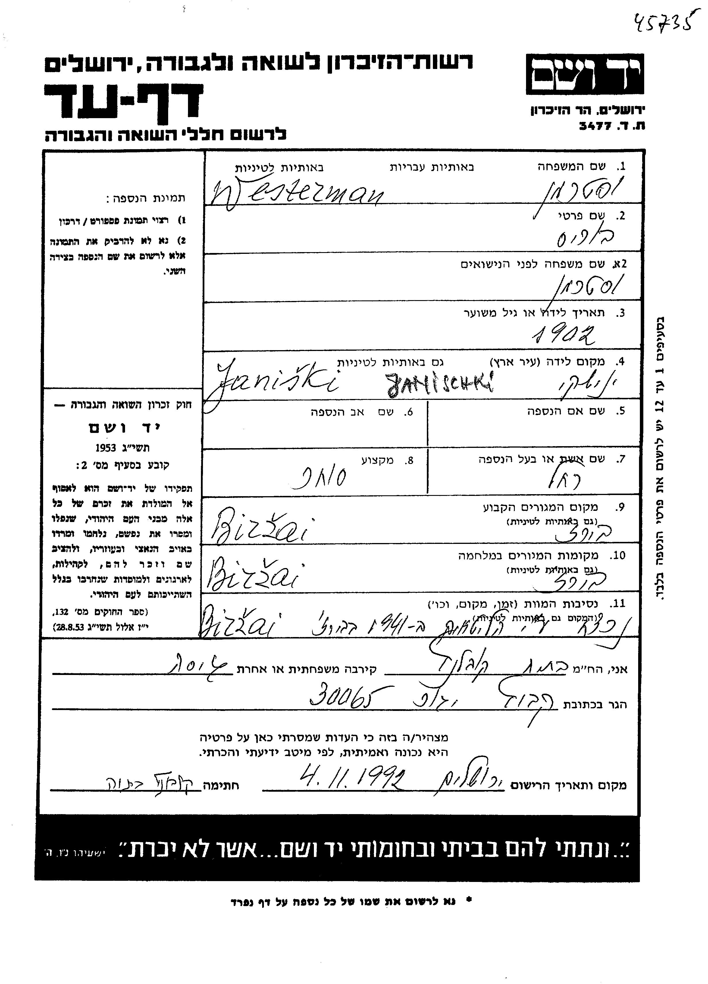 Вестерман Борис 1902 Бирзай, Литва Лист свидетельских показаний