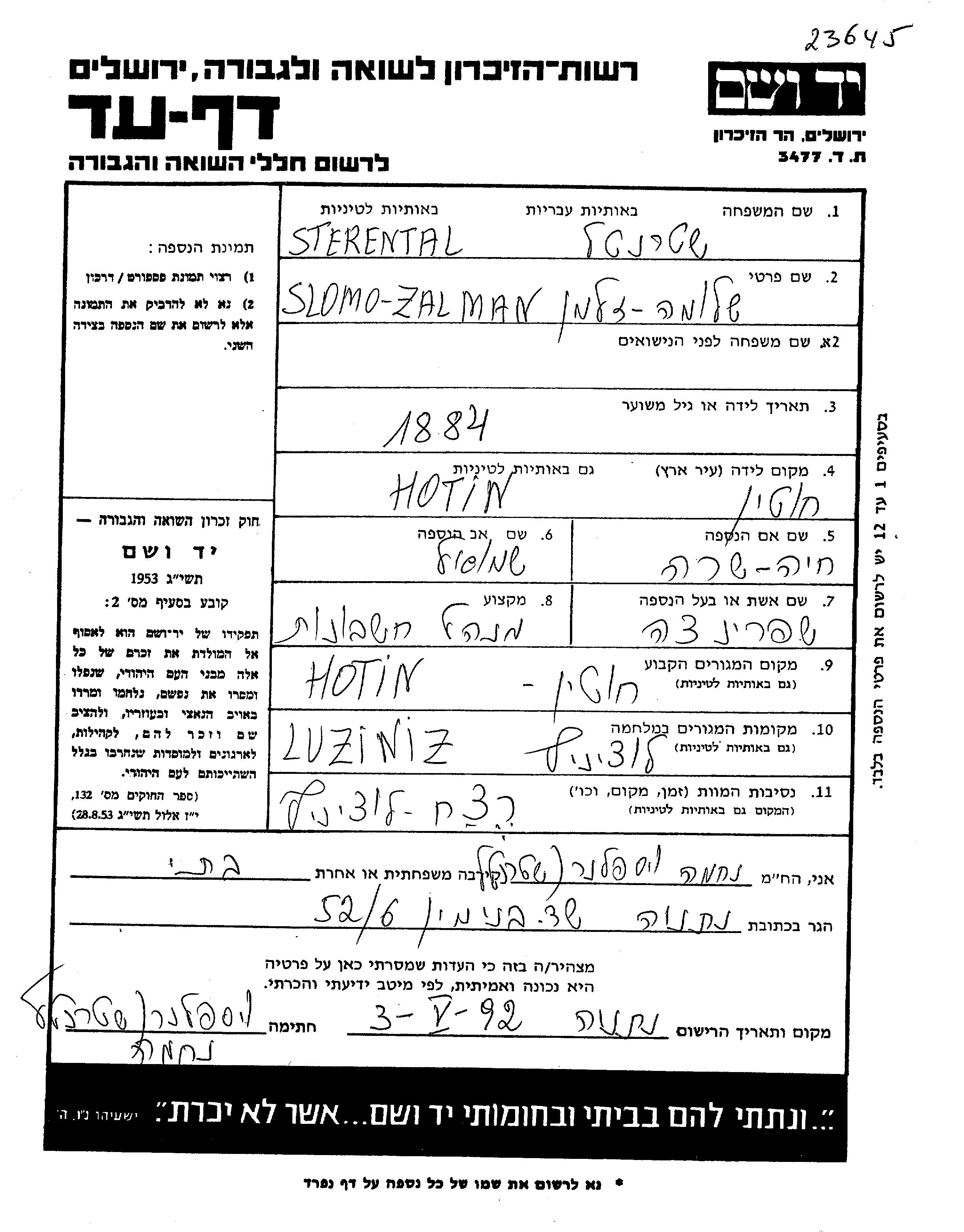 Шломо Залман Штеренталь, место рождения: Хотин, Румыния. Отец: Шмуэль, mать:Хая Сара. Женат / замужем. Место жительства до войны: Хотин, Румыния. Место во время войны: Лучинец, Украина (СССР).