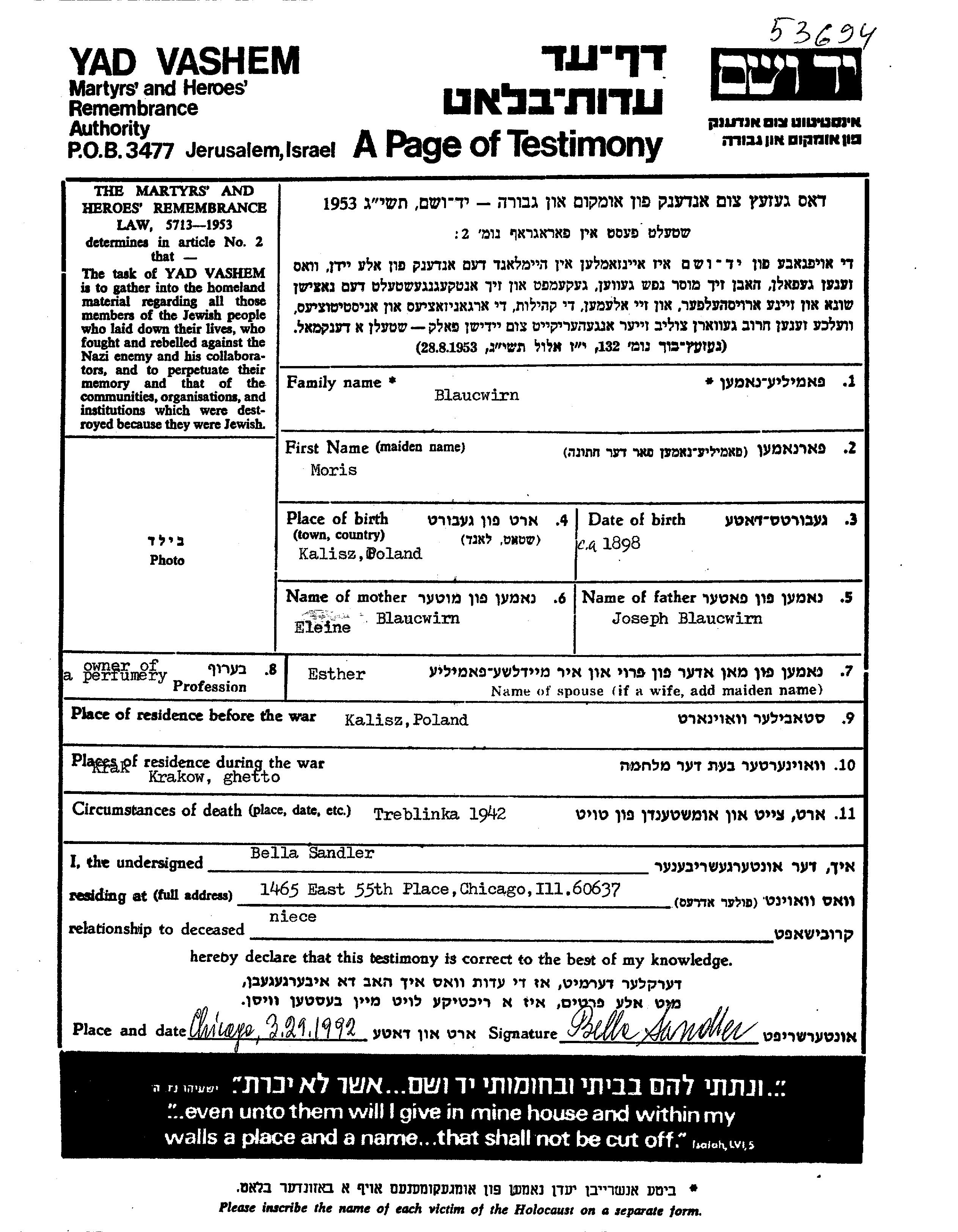 Морис Блауцвирн, место рождения: Калиш, Польша. Отец: Йосеф, mать:Элейн. Владелец / владелица магазина. Женат / замужем. Место жительства до войны: Калиш, Польша. Место во время войны: Краков, Польша.