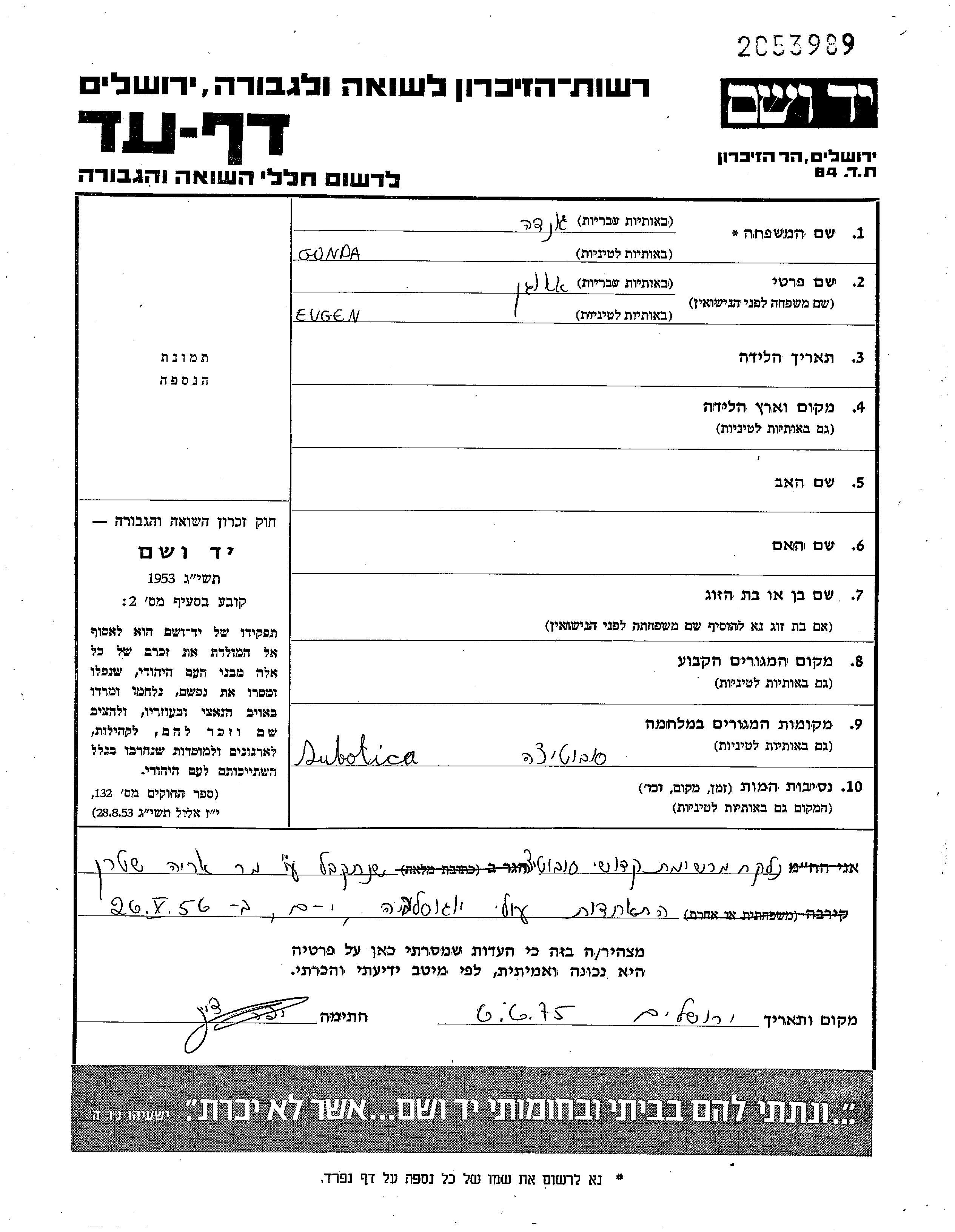 Эуген Гонда. Женат / замужем. Место жительства до войны: Суботица, Югославия. Место во время войны: Суботица, Югославия.