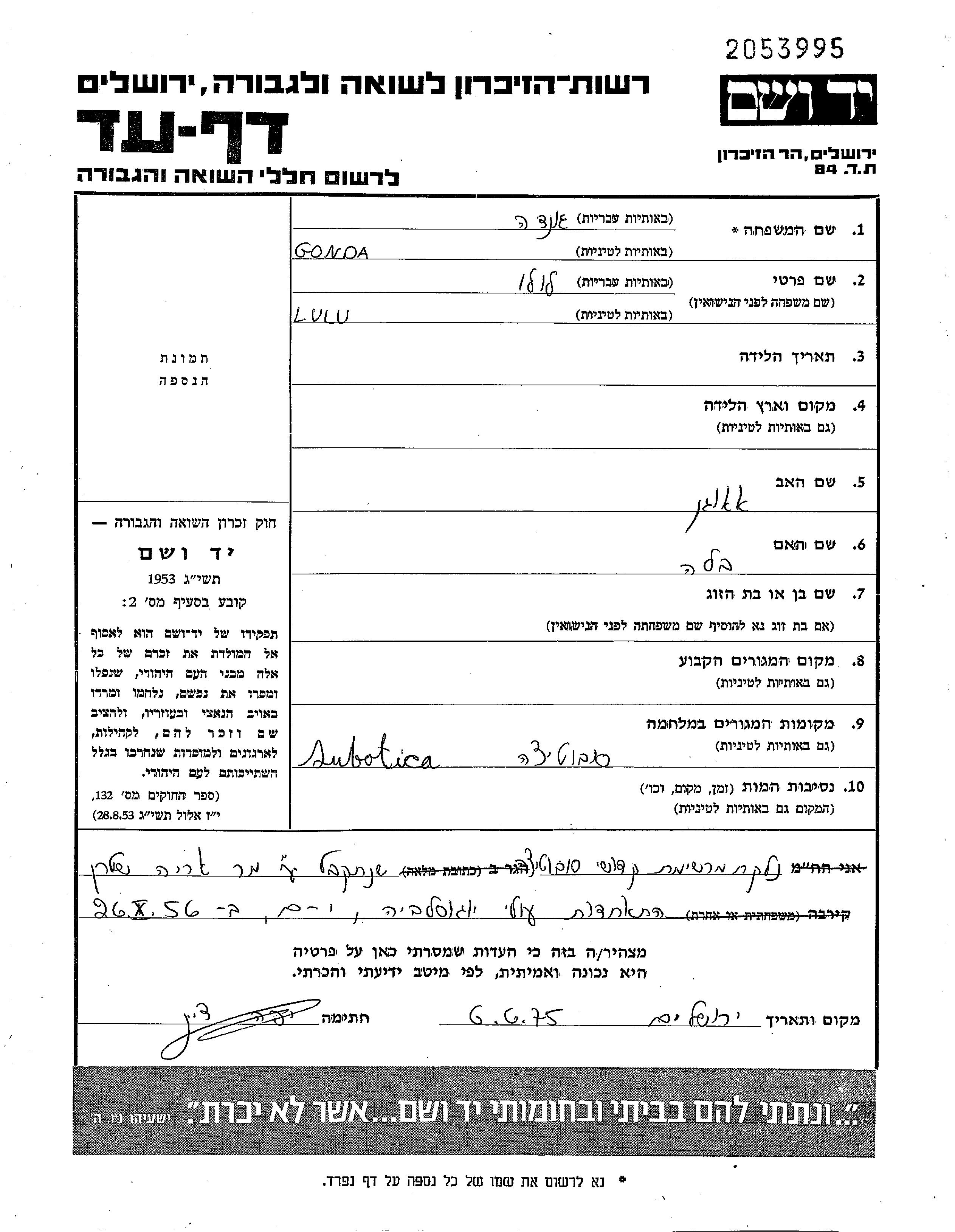 Гонда Лулу Суботица, Югославия Лист свидетельских показаний