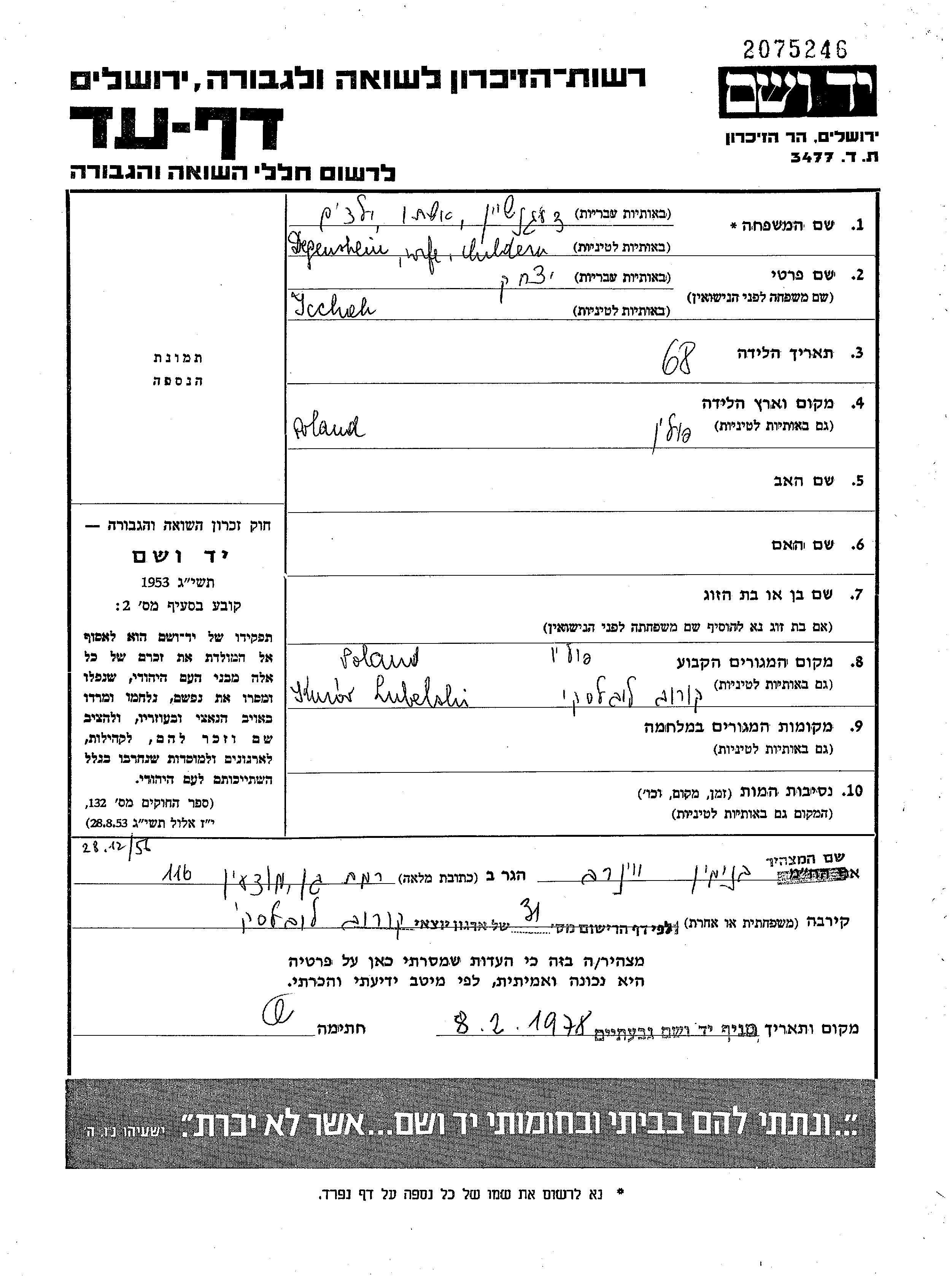 Ицхак Дегеншейн, место рождения: Польша. Женат / замужем. Место жительства до войны: Курув, Польша.