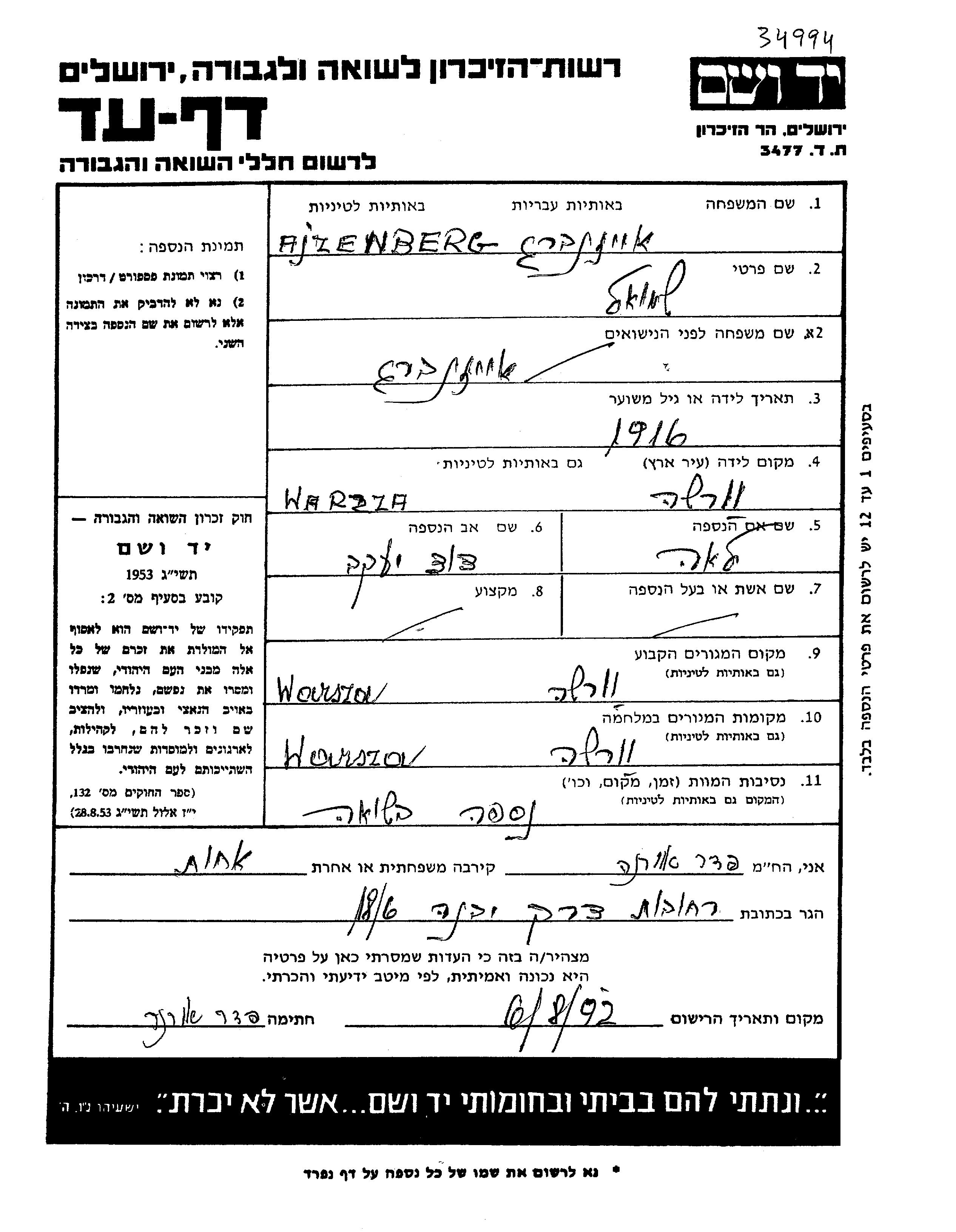 Айзенберг Шмауль 1916 Варшава, Польша Лист свидетельских показаний