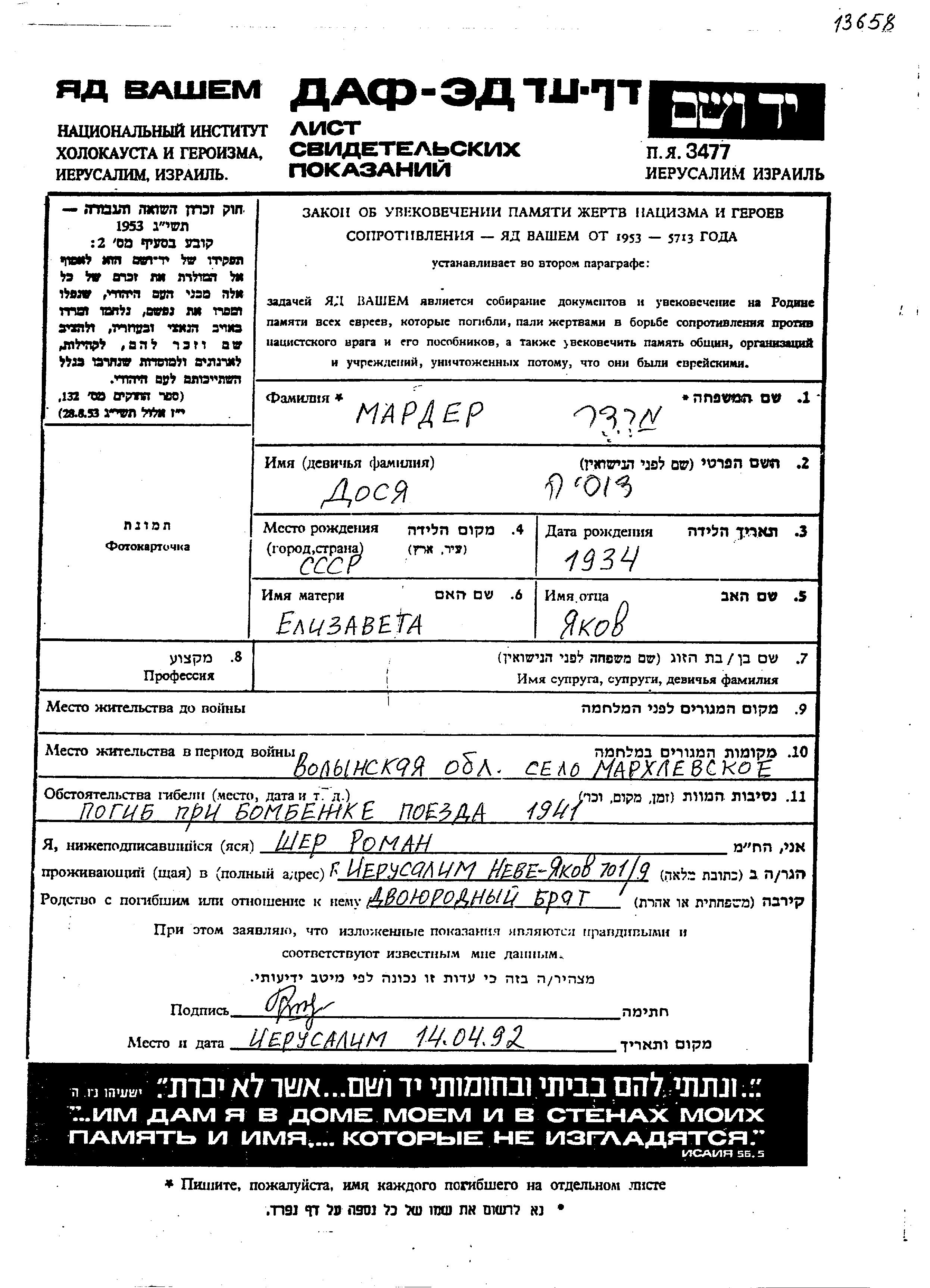 Дося Дуся Мердер, место рождения: СССР. Отец: Яков, mать:Елизавета, девичья фамилия Шер. Ребенок. Место во время войны: Мархлевск, Украина (СССР).