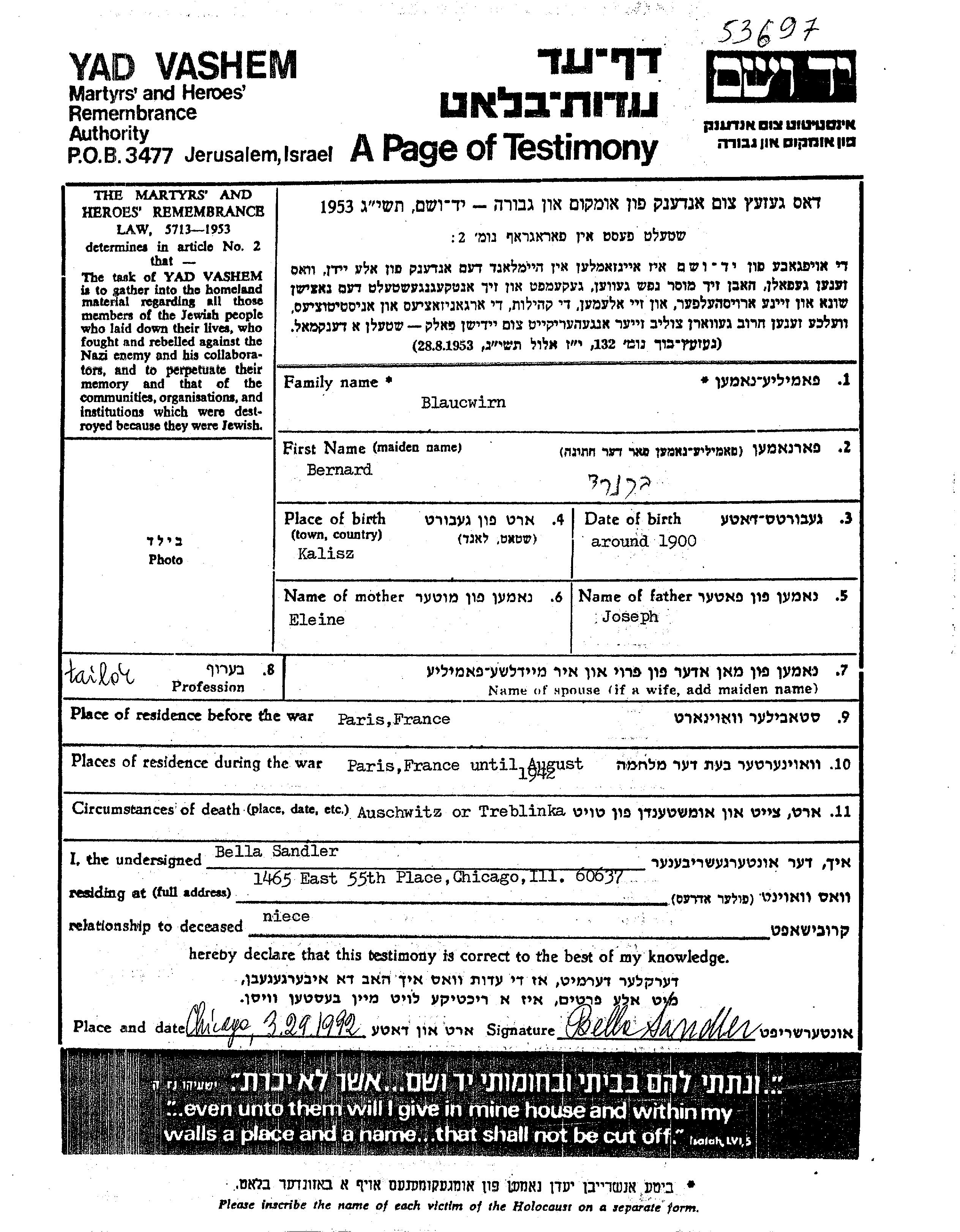Бернард Блауцвирн, место рождения: Калиш, Польша. Отец: Йосеф, mать:Элейн. Портной / портниха. Место жительства до войны: Париж, Франция. Место во время войны: Париж, Франция.