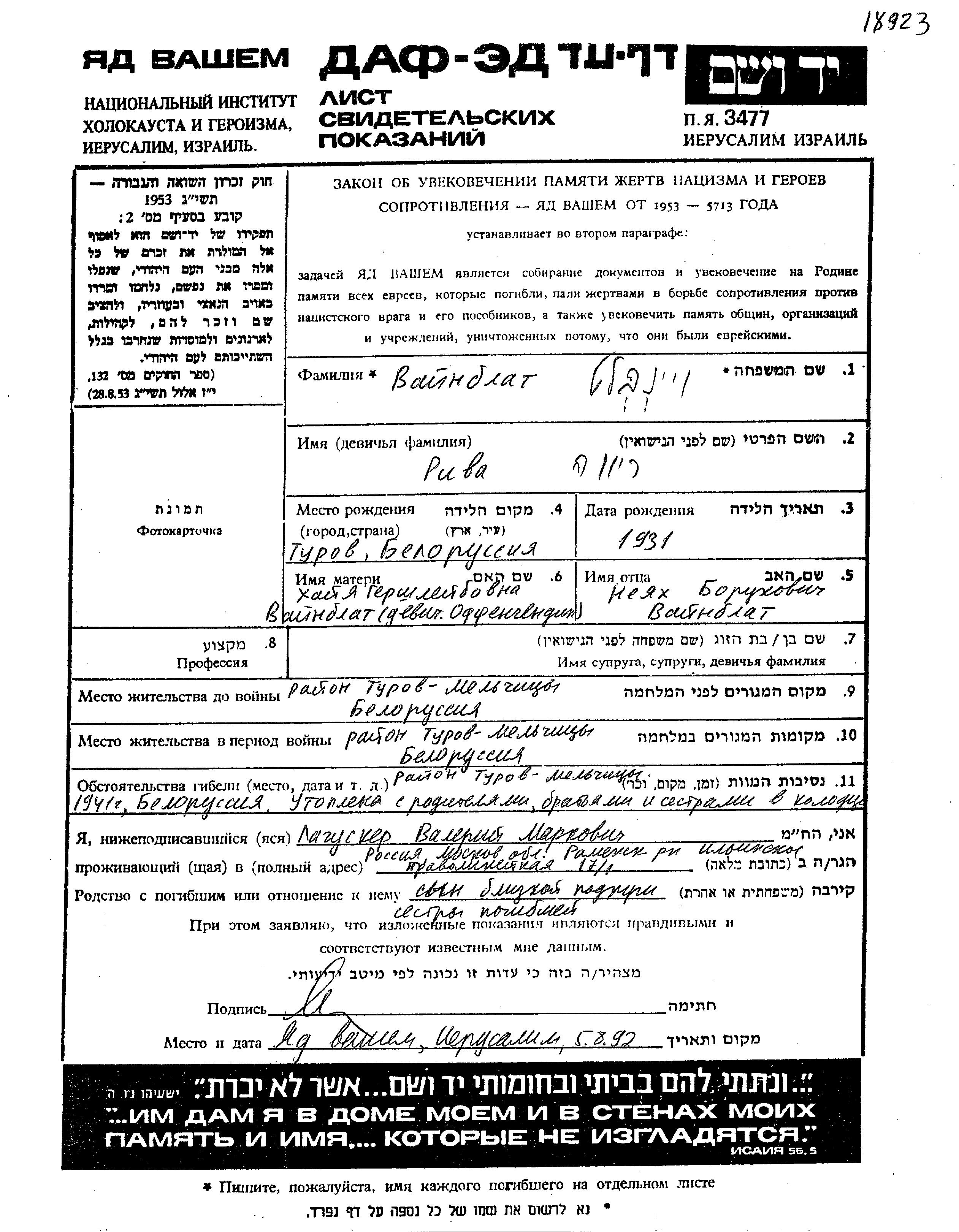 Вайнблат Рива 1931 Полесье, Белоруссия (СССР) Лист свидетельских показаний