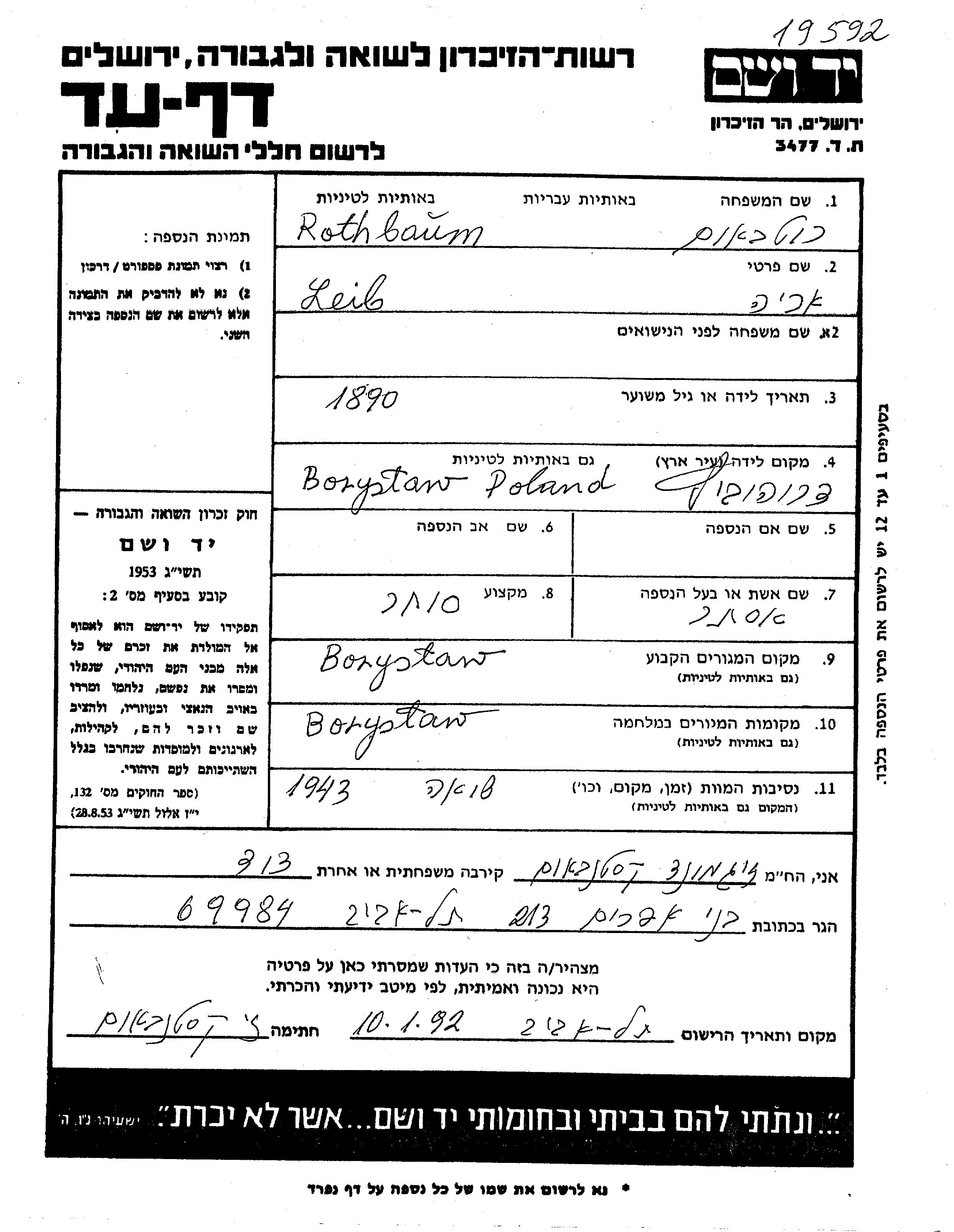 Арье Лейб Ротбаум, место рождения: Борислав, Польша. Торговец / торговка. Женат / замужем. Место жительства до войны: Борислав, Польша. Место во время войны: Борислав, Польша.