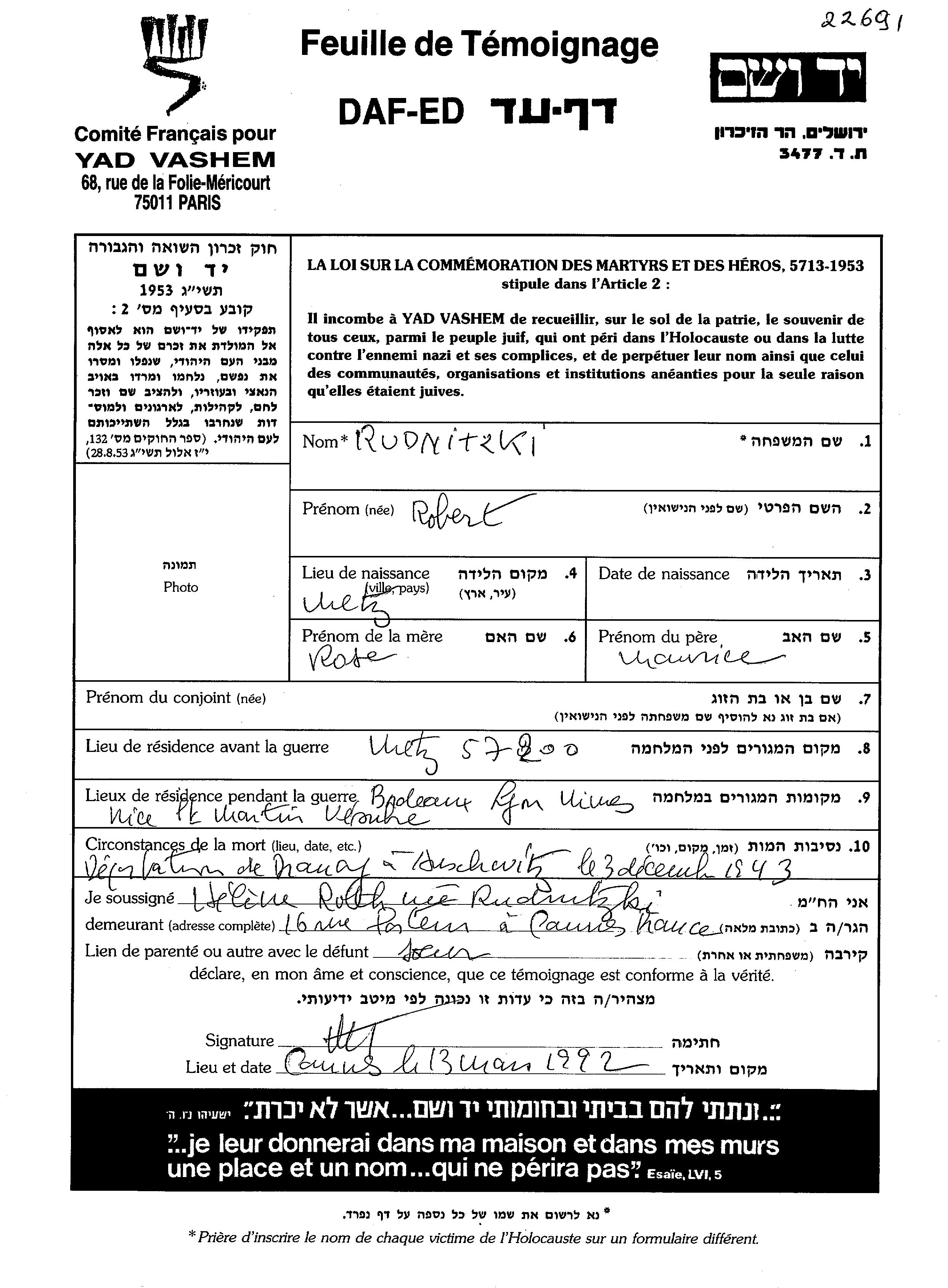 Роберт Родницки, место рождения: Мец, Франция. Отец: Морис, mать:Роз, девичья фамилия Шибер. Место жительства до войны: Мец, Франция. Место во время войны: Сен-Мартен-Везюби, Франция.