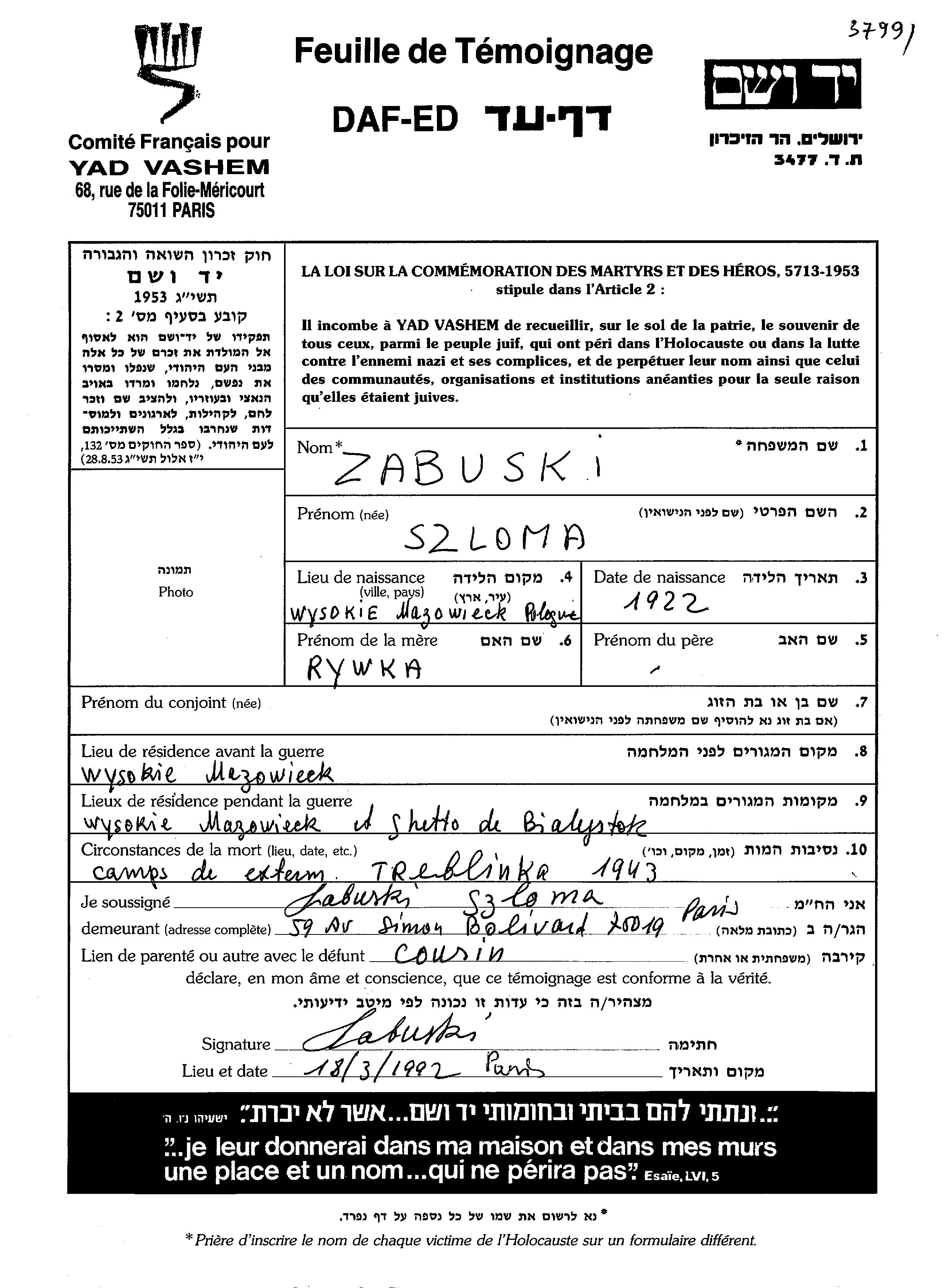 Шлома Забуски, место рождения: Высоке-Мазовецке, Польша.Mать:Рывка. Место жительства до войны: Высоке-Мазовецке, Польша. Место во время войны: Белосток, Польша.