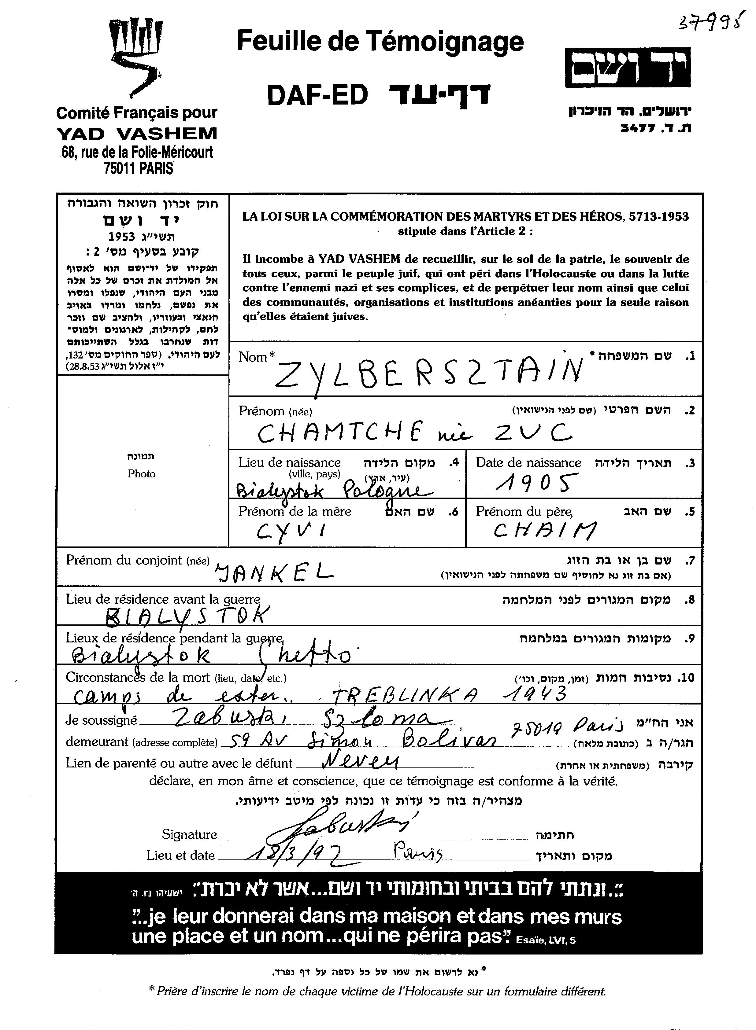 Зильберштайн Хамче 1905 Белосток, Польша Лист свидетельских показаний