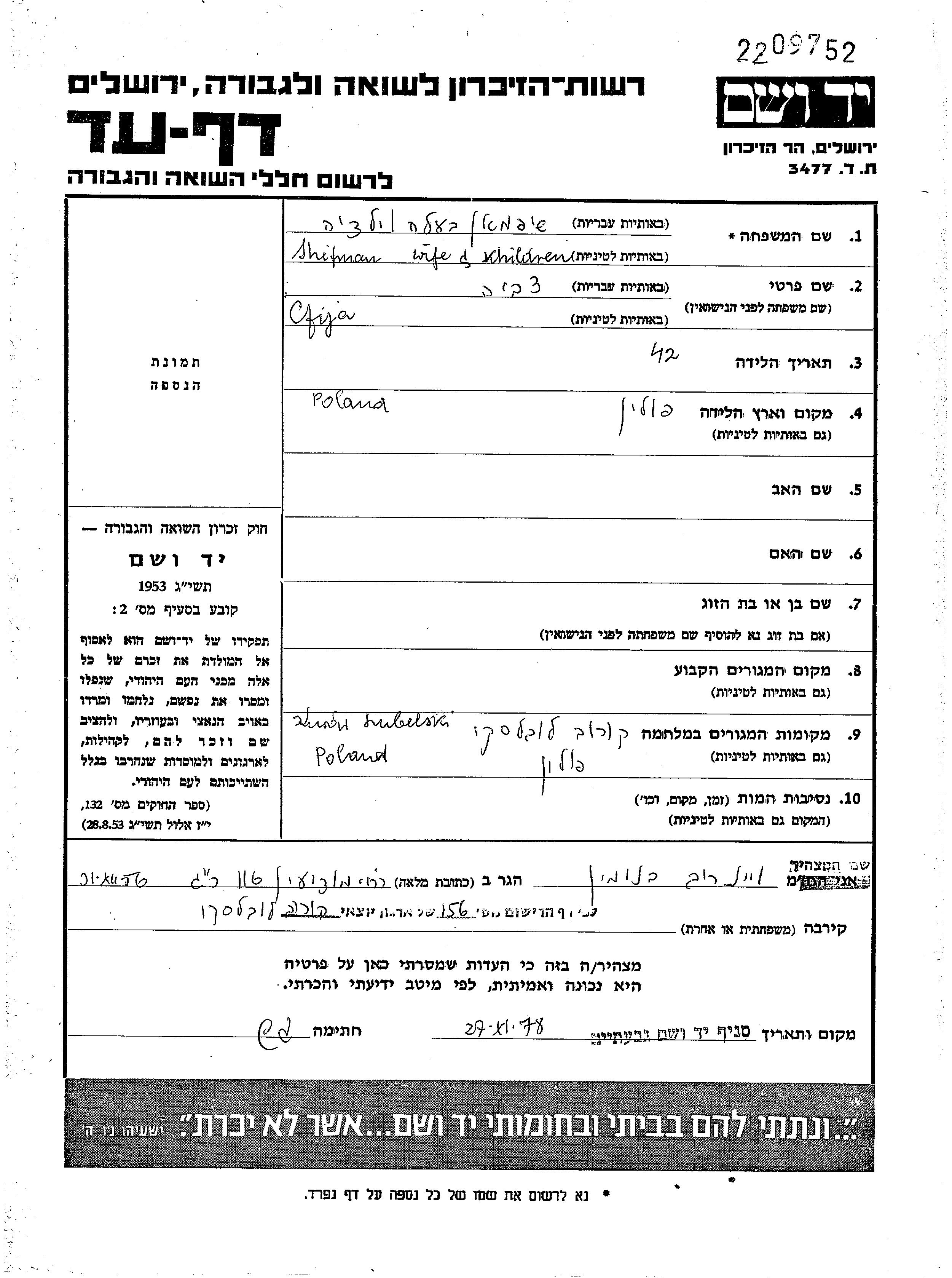 Яд Вашем - Листы свидетельских показаний Мемориального фонда