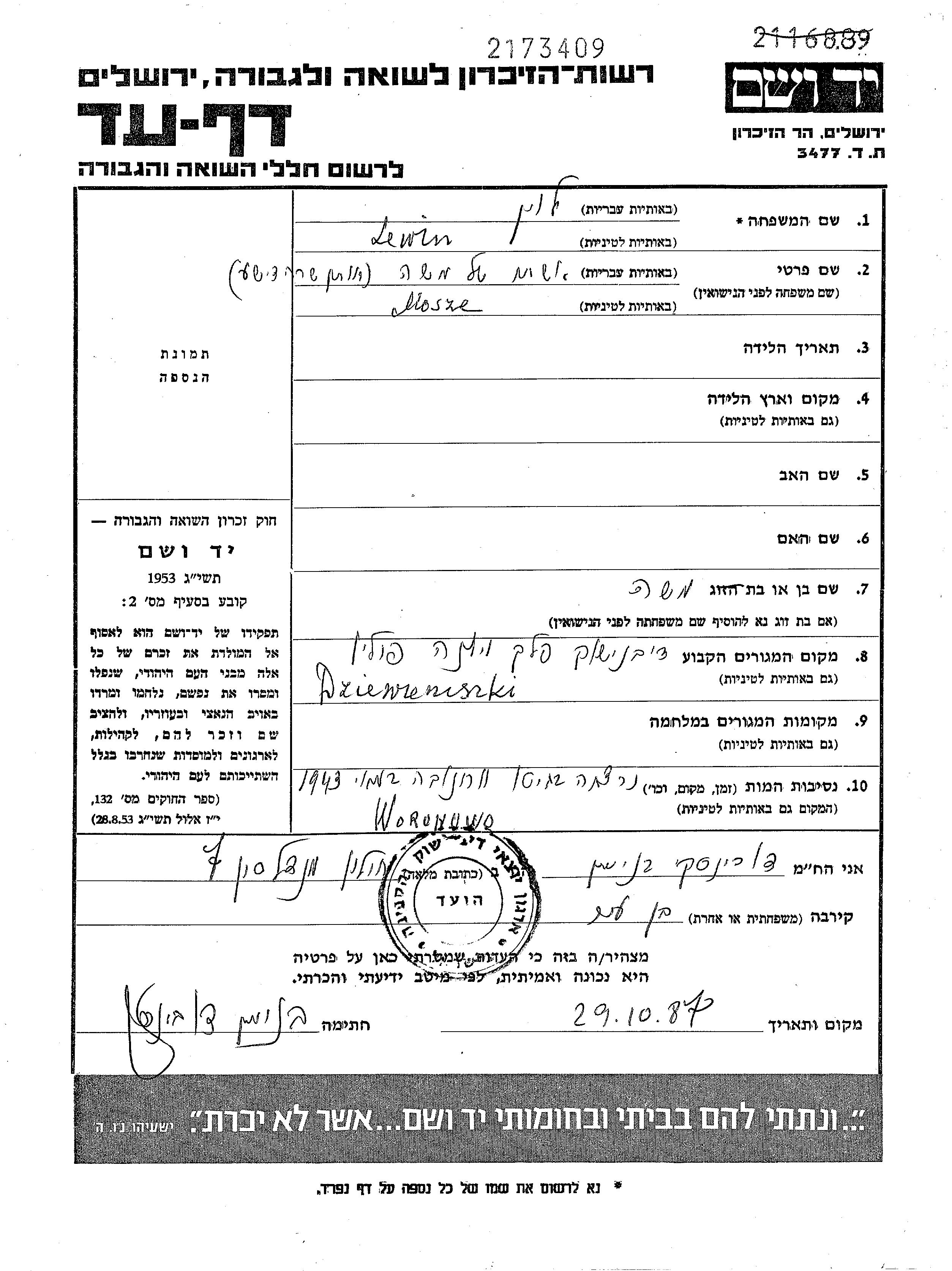 Левин Имя неизвестно Девенишки, Польша Лист свидетельских показаний